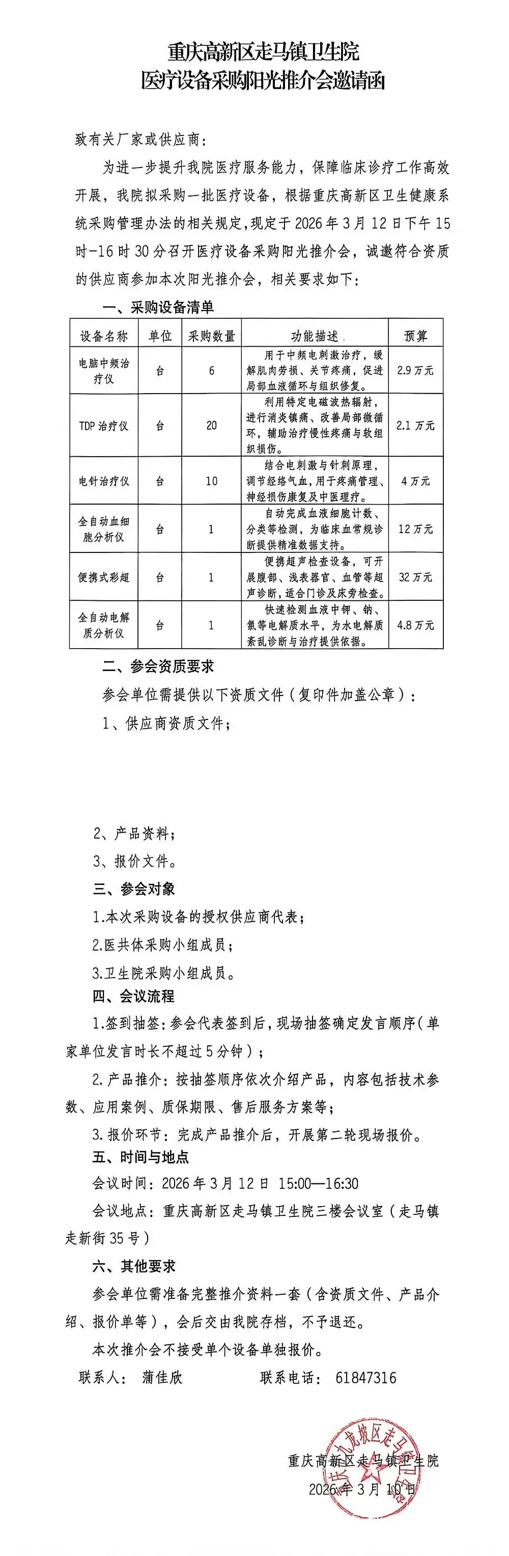 走马镇卫生院医疗设备采购阳光推介会邀请函