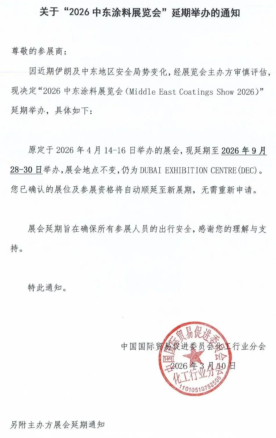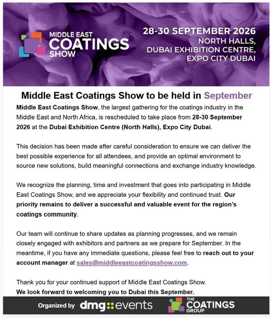 关于“2026中东涂料展览会”延期举办的通知
