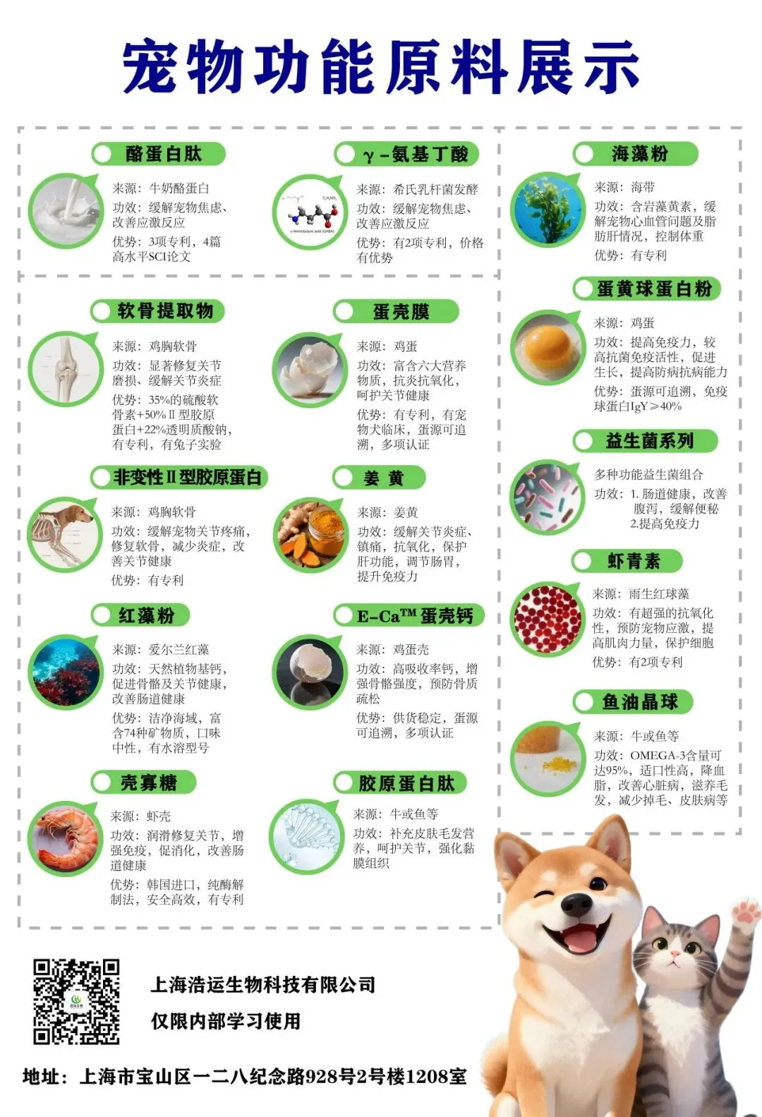上海浩运生物科技有限公司位于国际化大都市—上海,是一家提供功能性食品原料、普通食品原料和宠物食品原料及成品的专业供应商,在全球范围内甄选天然、安全、健康的优质原料,通过自主研发功效原料及代理国内外精选原料,打造浩运特色原料供应平台,同时还为客户提供产品配方方案、成品及产品售后服务,满足市场功能原料及健康食品等多层次需求。