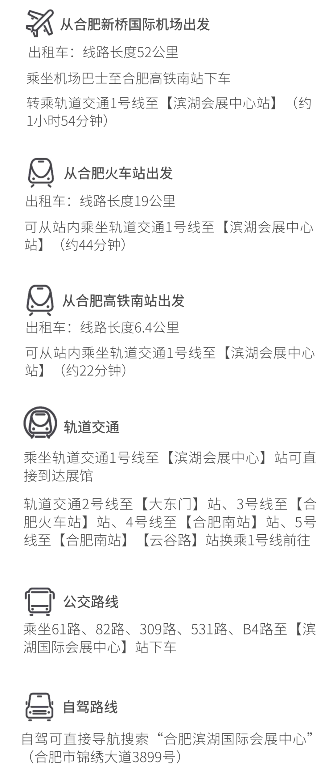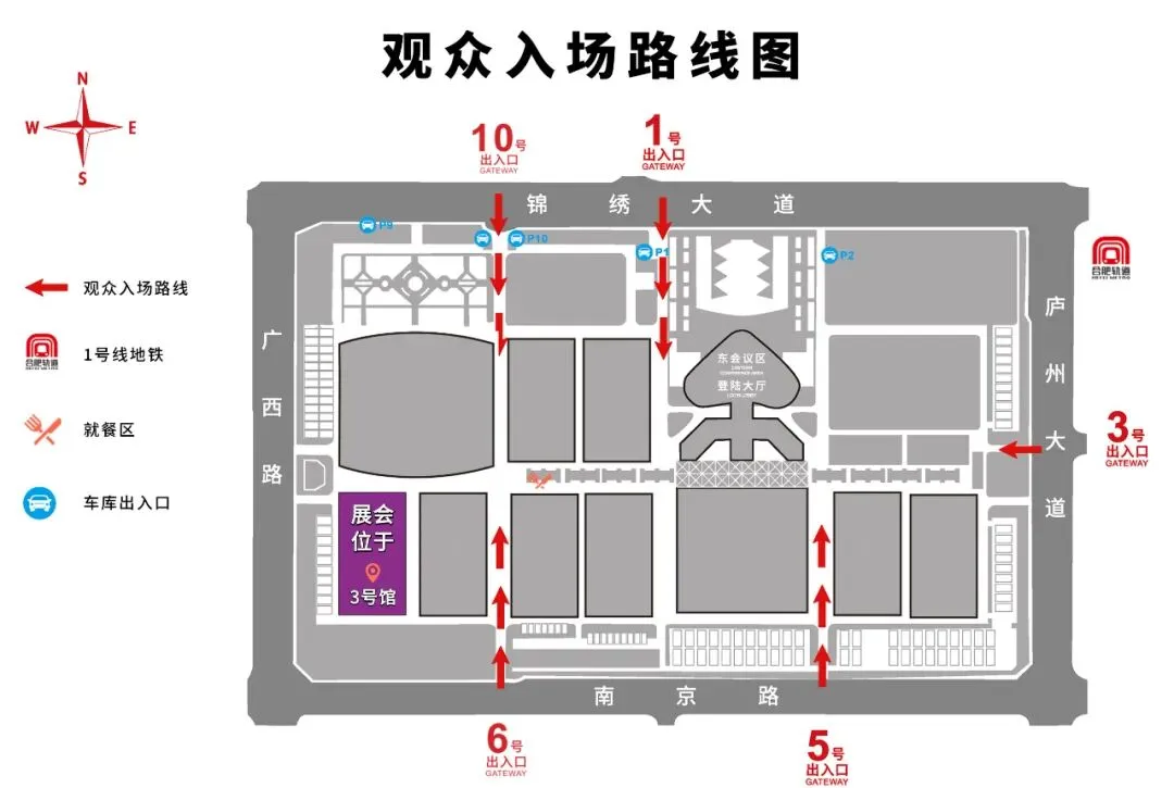 1. 观众请由上图所示锦绣大道10号、1号道口,庐州大道3号道口,南京路5号、6号道口进出参观。