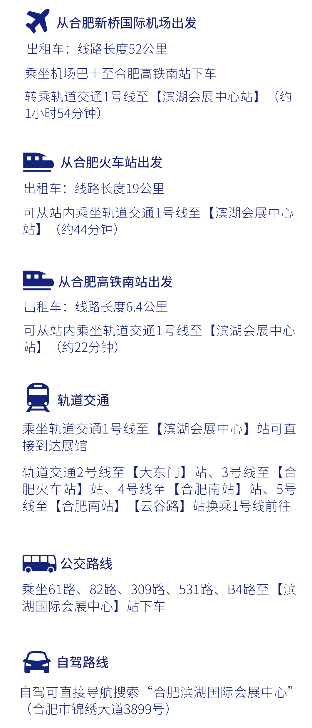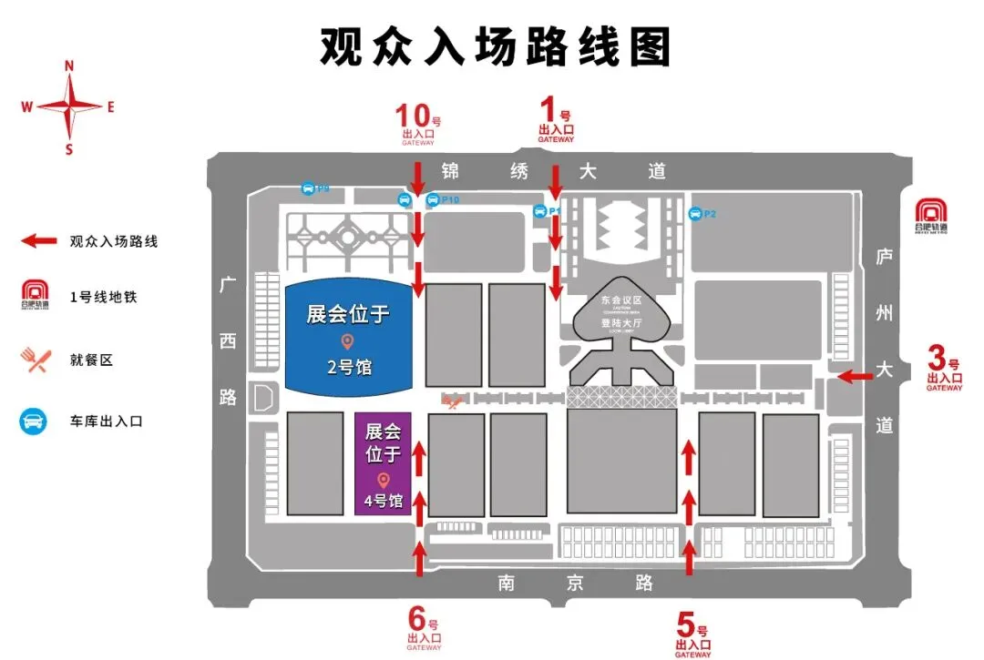 1. 观众请由上图所示锦绣大道10号、1号道口,庐州大道3号道口,南京路5号、6号道口进出参观。