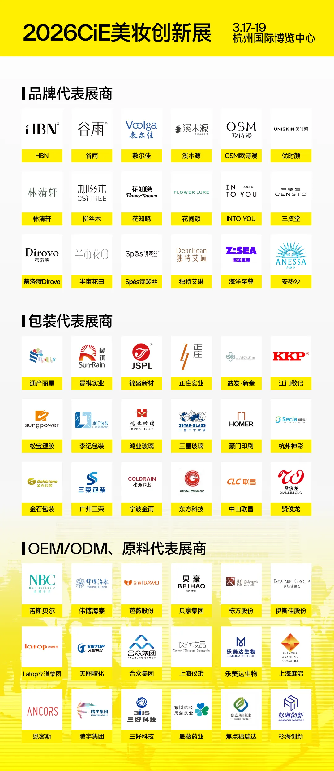 OEM/ODM、创新原料代表展商:诺斯贝尔、伟博海泰、芭薇股份、贝豪集团、栋方股份、伊斯佳股份、Latop立道集团、天图精化、合众集团、上海仪玳、乐美达生物、上海麻沼、恩客斯、腾宇集团、三好科技、晟薇药业、焦点福瑞达、杉海创新…