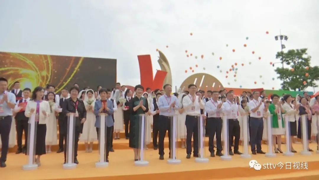 蓝天、白云见证爱情,鲜花、气球点缀婚礼,潮汕历史文化博览中心幸福洋溢。参加本次百对新人集体婚礼的“新人”来自各行各业,既有热恋中的准新人,也有已婚多年的“老新人”。