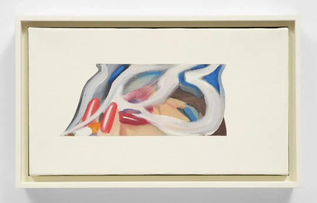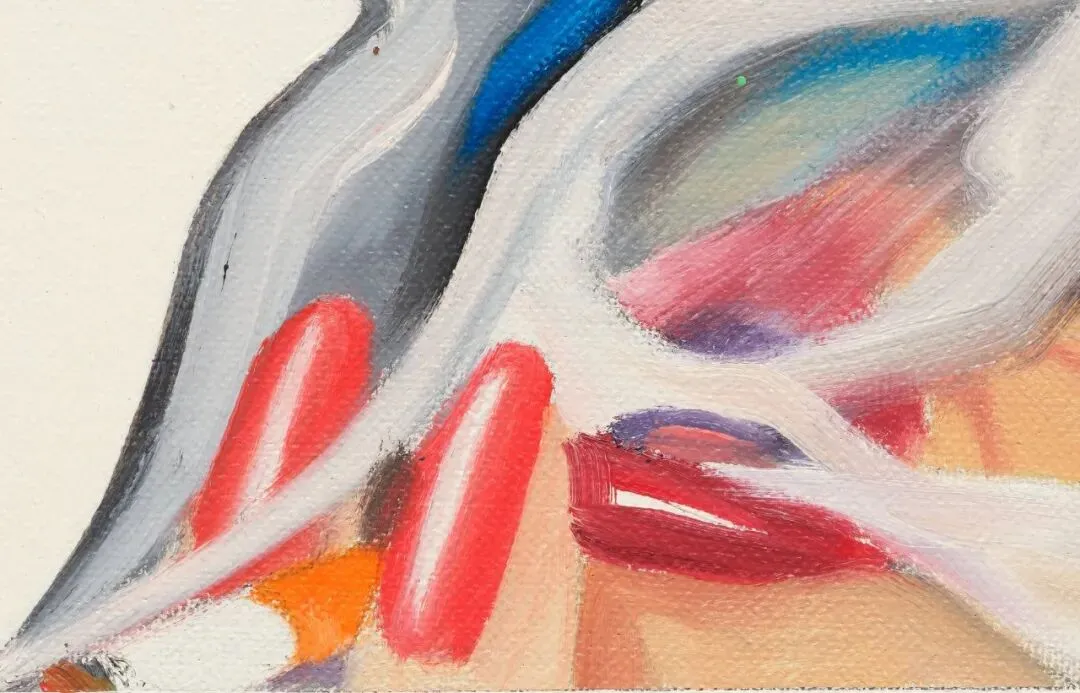 威瑟尔曼发现摄影是捕捉模特姿态的有效媒介,这些照片后来被转化为大型作品。一次,他的朋友佩吉·萨诺(Peggy Sarno)在拍模特时点燃香烟,威瑟尔曼拍摄了她吸烟的瞬间,保持斜倚姿势。这一瞬间启发了“吸烟者”系列,其特征是鲜红的嘴唇与缭绕的白烟形成强烈对比。《吸烟者面孔习作》大胆而亲密,捕捉了单一的愉悦瞬间,同时在复杂且雄心勃勃的构图中体现了艺术家在主题、形式与色彩上的实验探索。该作品不仅展示了威瑟尔曼对流行文化与女性身体的兴趣,也体现了他对油画技巧的娴熟掌握、细节处理的精细以及成熟的构图风格。