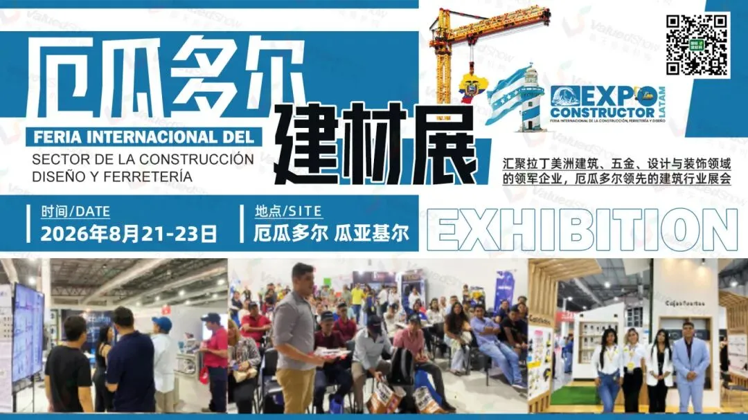 推荐理由:由哥伦比亚建筑商会(CAMACOL)主办,两年一届,是哥伦比亚最重要的建材展会之一。作为一个国际性展会,每年都吸引了来自世界各自的专业展商和观众前来现场。厄瓜多尔政府将基建作为优先发展方向,重点推进道路、港口、机场及社会住房项目。曼塔港扩建、基多地铁运营配套、瓜亚基尔城市更新等项目持续推进。其次,厄瓜多尔是美元化国家,汇率稳定,与中国在工业机械、建材、医疗设备等领域合作紧密,建材等工业制成品进口需求显著,市场发展潜力可观。