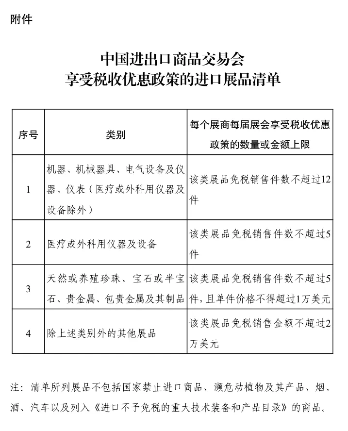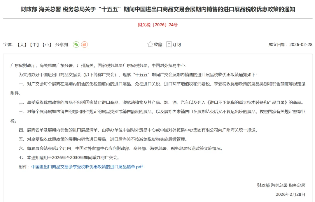 关于“十五五”期间中国进出口商品交易会展期内销售的进口展品税收优惠政策的通知(财关税〔2026〕24号)
