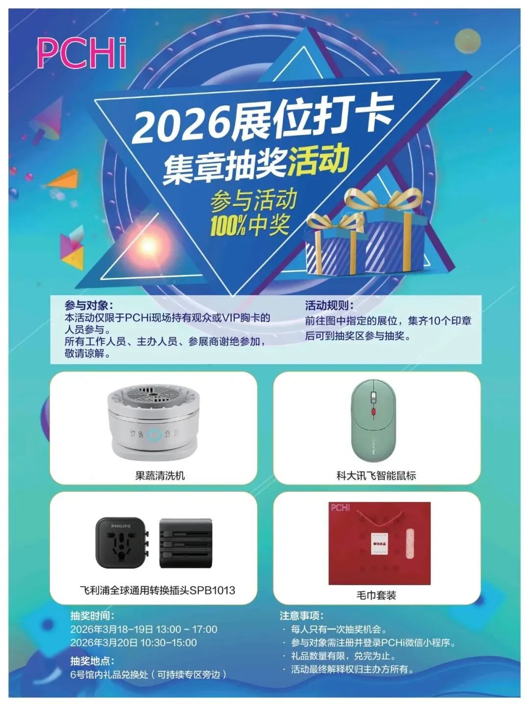 PCHi 2026到场观众福利大放送!现场观众可前往观众登记区领取打卡活动单页。参考活动详情,至打卡展位盖章,集齐10个印章后,至6号馆内礼品兑换处参与抽奖。