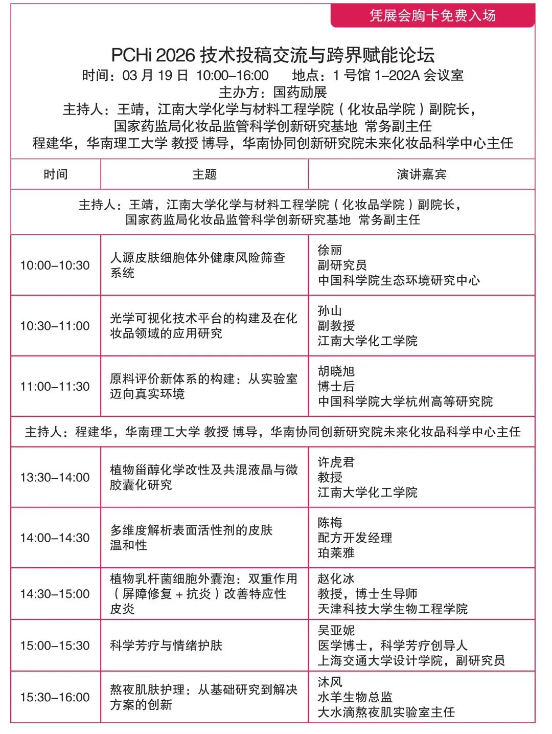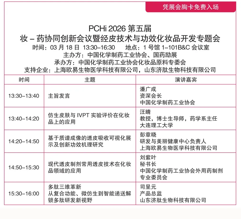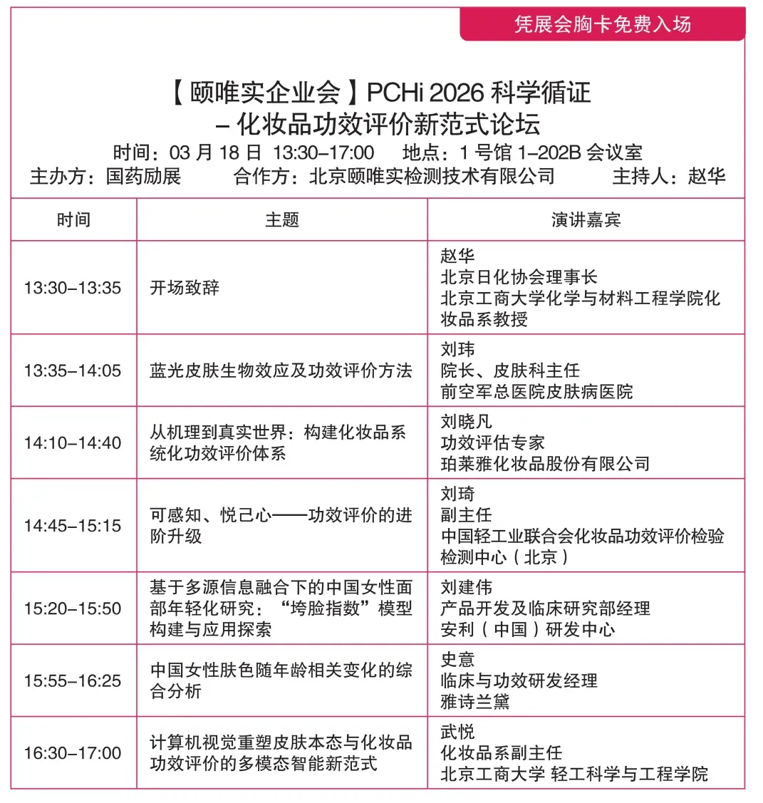 PCHi2026行业年度大会作为中国化妆品行业的年度技术盛会,将与展览同期,于2026年3月18-20日在杭州大会展中心拉开序幕!大会议题经行业权威智囊团-PCHi专家委员会CSTIC专家指导,拟定从政策法规、原料技术、产品配方、功效评价、市场趋势、出海趋势、医美护肤、彩妆创新、科学传播、人工智能应用、皮肤科学与临床应用、包装设计、前沿科学与基础研究、高校学术成果转化、跨界领域技术 等多角度展开,呈现行业创新研究成果,与行业携手,共创新生。