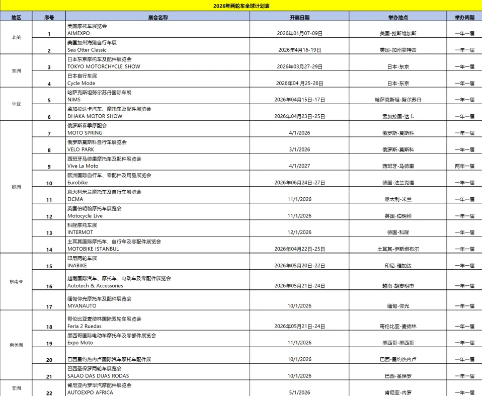 2026年全球两轮车展览计划表
