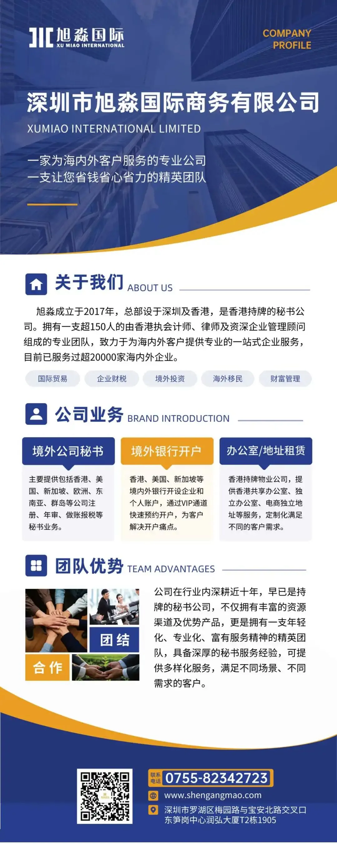 Xumiao International was founded in 2017, with its headquarters located in Shenzhen and offices established in Hong Kong and Malaysia. It is a licensed secretarial company in Hong Kong. Boasting a professional team of over 150 members, including certified public accountants, lawyers, and senior enterprise management consultants from Hong Kong, the company is committed to providing professional one-stop enterprise services to clients both domestically and internationally. To date, it has served over 20,000 enterprises both domestically and internationally.