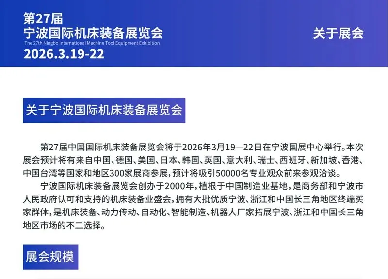 宁波国际机床装备展览会创办于2000年,是机床装备、动力传动、自动化、智能制造、机器人厂家拓展宁波、浙江和中国长三角地区市场的不二选择。