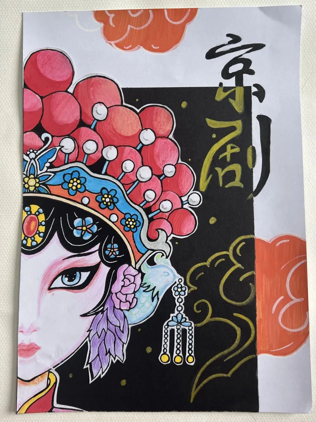 旦角的凤冠霞帔、眉眼流转,一笔一画都透着京剧“以形传神”的韵味,红与黑的撞色,让国粹之美跃然纸上。
