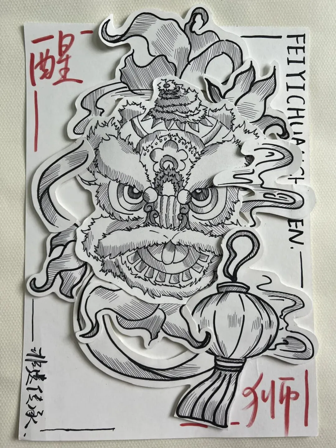 黑白线条勾勒出狮头的威严,“醒”字落笔铿锵有力,将醒狮舞中“唤醒东方”的气魄,凝缩在方寸之间。