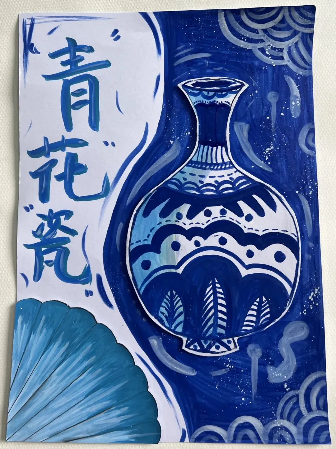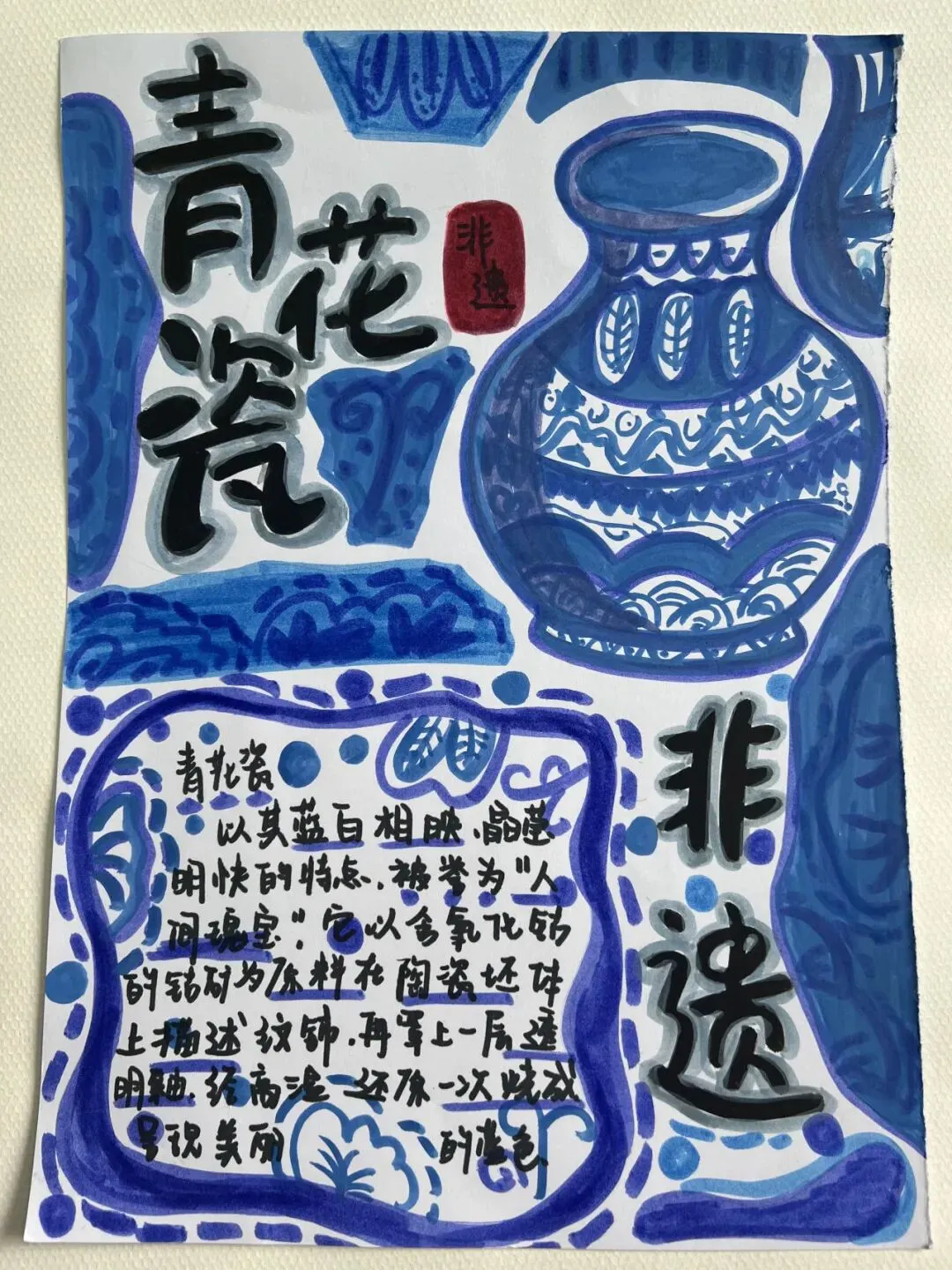 蓝与白的经典碰撞,勾勒出瓷器上的缠枝纹样。同学们用文字写下“人间瑰宝”的注解,让这抹来自宋元的青色,在纸上重新流动。