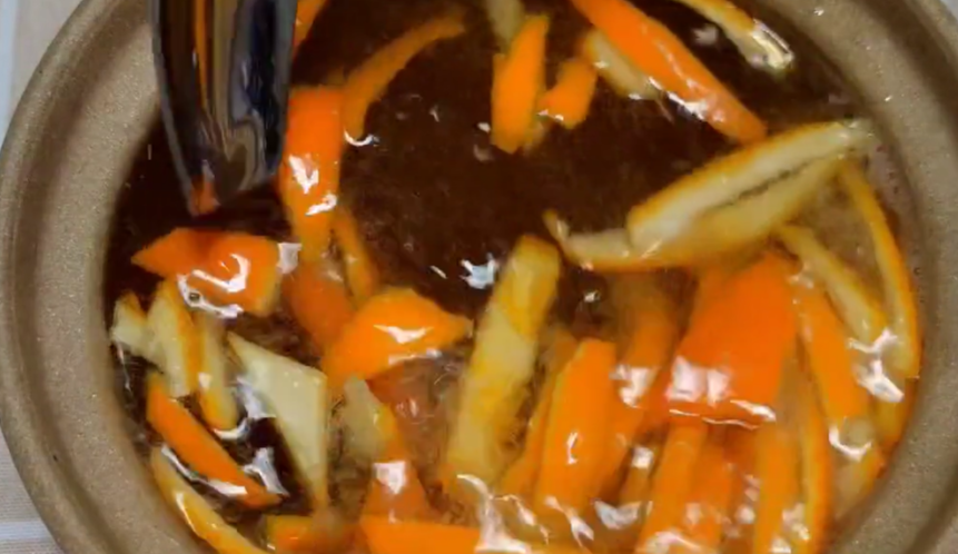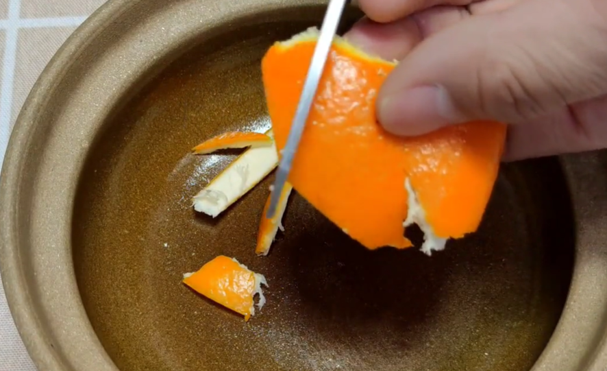 首先准备好一个容器,然后把一些果皮放进去,我选的是橙皮,其他的果皮和果渣都可以,这种果皮是含糖的,还有一些水份,还有一些香气,切的越细,香气就会越明显。