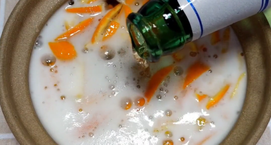然后加入适量的白糖,白糖的量可以稍多一些,然后加入少量的苏打粉,最后加入啤酒,啤酒的量也不多,只要不沾果皮就行了,这是一种充满了麦芽香气,酵母和二氧化碳混合在一起的啤酒。