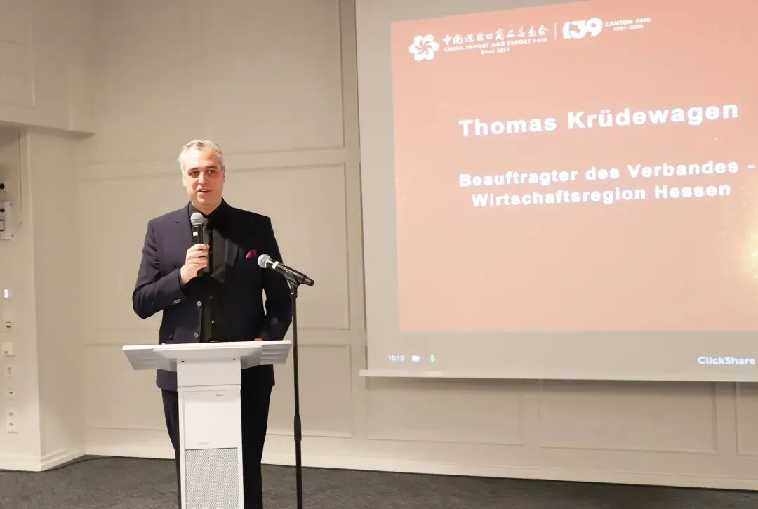 克吕德瓦根在发言中介绍,中小企业是德国经济的核心支柱,全国约有344万家中小企业,承载着创新、就业与出口的重要使命。德国联邦中小企业联合会网络覆盖约90万家企业,在推动国际经贸合作中发挥着关键作用。他表示,莱茵—美因地区产业基础雄厚,德国企业在工程技术、专业化领域优势显著,而中国企业在生产能力、创新速度和市场规模上表现突出,双方优势互补、合作空间广阔,广交会等优质平台为两国企业拓展市场、对接资源提供了宝贵机遇。