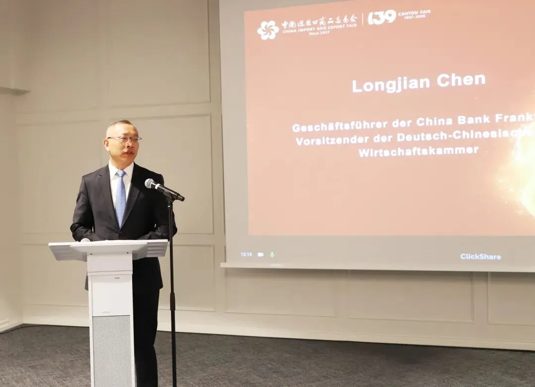 陈隆建在致辞中表示,广交会作为中国对外开放的重要窗口和国际贸易合作的核心平台,多年来为中外企业搭建了高效对接的桥梁。中国银行长期深耕外贸金融服务,通过“广交会金融服务月”等特色举措,全力支持外贸企业发展。2026年是中国“十五五”规划开局之年,中德经贸合作正持续深化,合作领域从传统制造业向数字经济、绿色低碳、人工智能等新兴领域延伸,中国银行法兰克福分行将继续发挥金融桥梁作用,助力两国企业把握中国市场机遇、实现互利共赢。