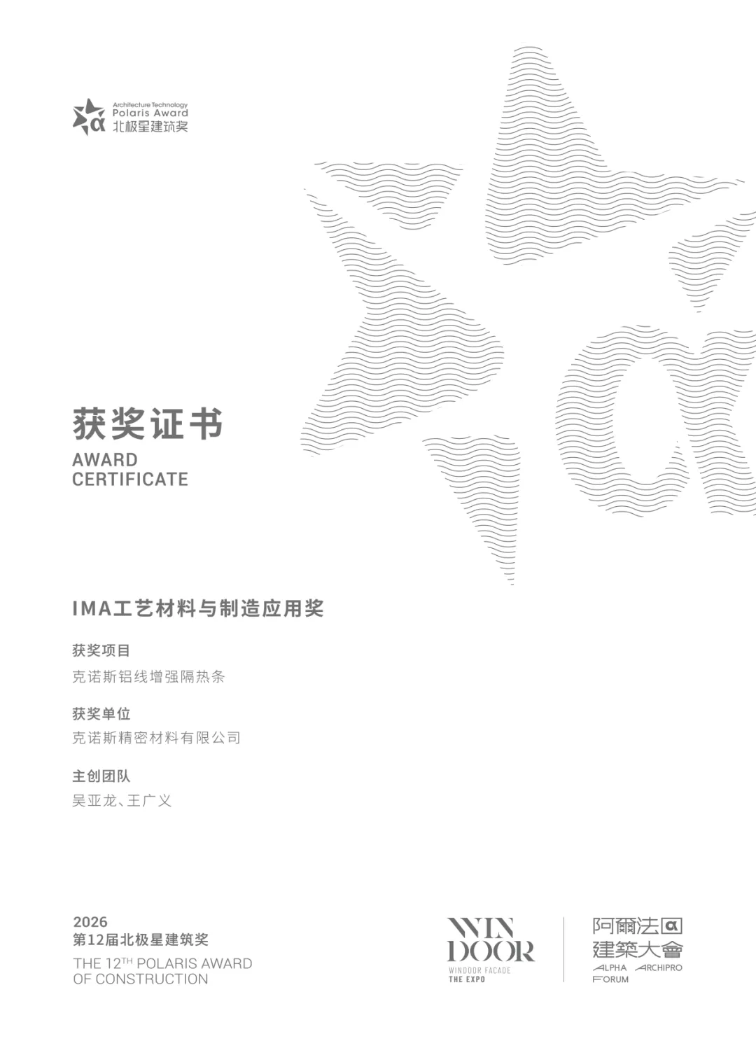 克诺斯(KRONOS)铝线增强隔热条凭借卓越的技术创新和性能优势,在众多参评产品中脱颖而出,荣获IMA工艺材料与制造应用奖。