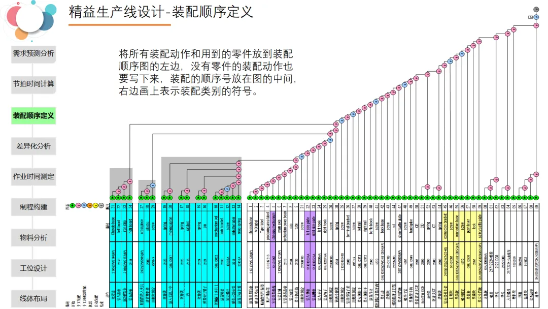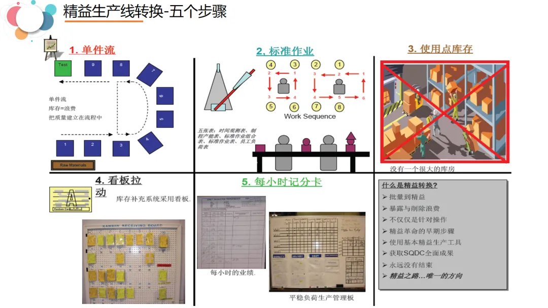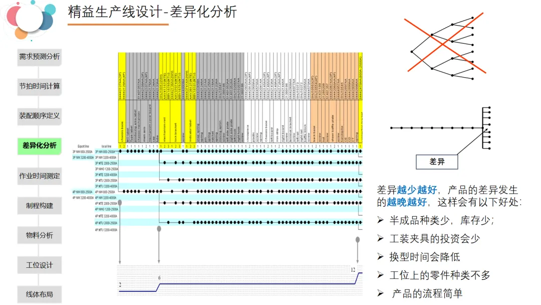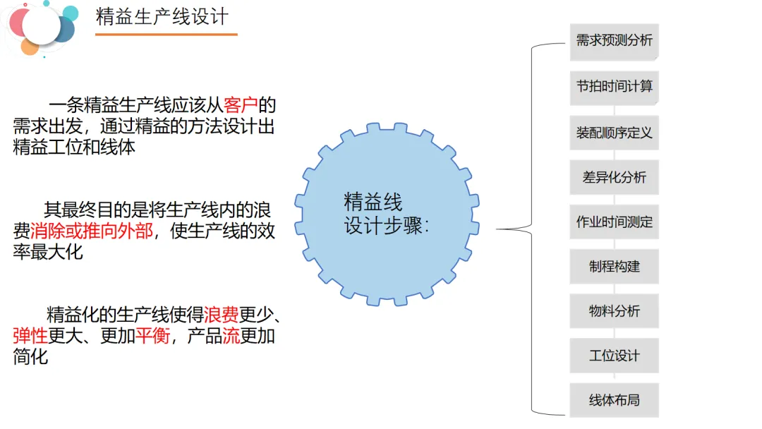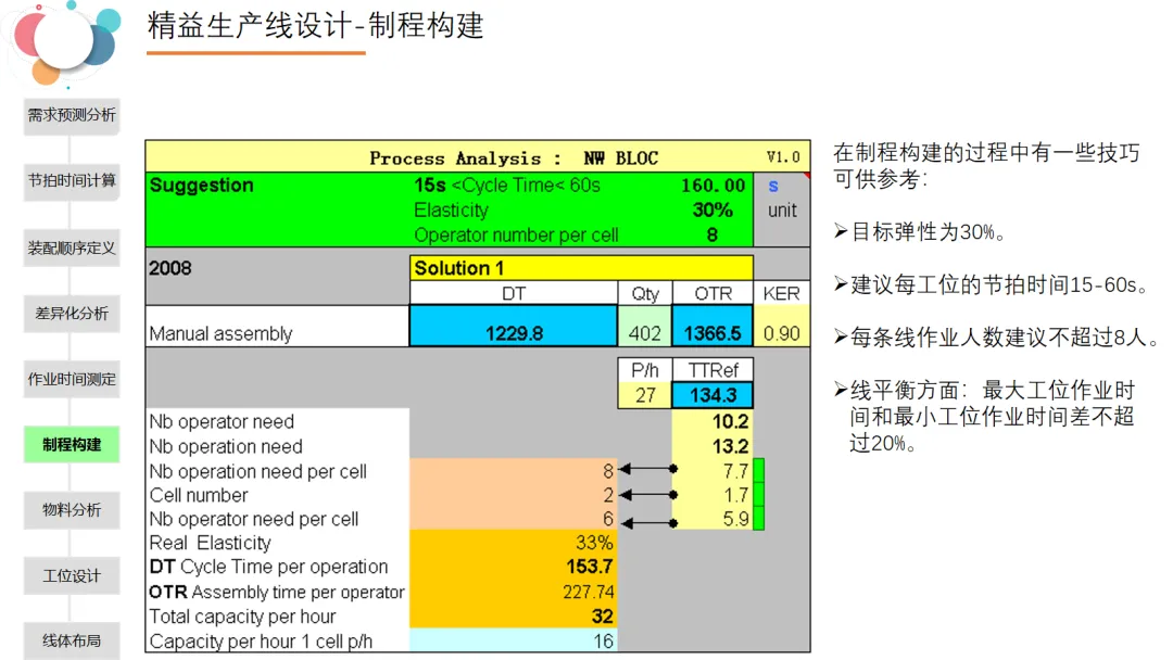 本文全面阐述了精益生产线设计的核心理念、实施步骤与具体方法,强调以客户需求为起点,通过系统化设计消除浪费、提升效率。内容首先介绍了精益生产的基本原则——改善质量、降低成本、缩短周期,并提出了“向上游挤压浪费”的导入策略。随后,详细展示了精益生产线转换的五个步骤:从单件流、标准化作业、物料移动到使用点、看板拉动到时产考核,每一步都配有具体操作要求。在生产线设计部分,PPT系统梳理了从需求预测、节拍时间计算、装配顺序定义、差异化分析、物料分析、工位设计到线体布局的完整流程,并强调节拍时间是设计的基础。最后,通过流水线与单元线布局实例,展示了不同类型产线的实际应用。