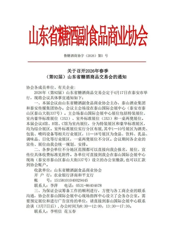 3月6日,2026年(第92届)山东省糖酒商品交易会预备会议暨新闻发布会在泰安召开,会上正式宣布2026年(第92届)山东省糖酒商品交易会将于4月17日在泰山国际会展中心开幕。