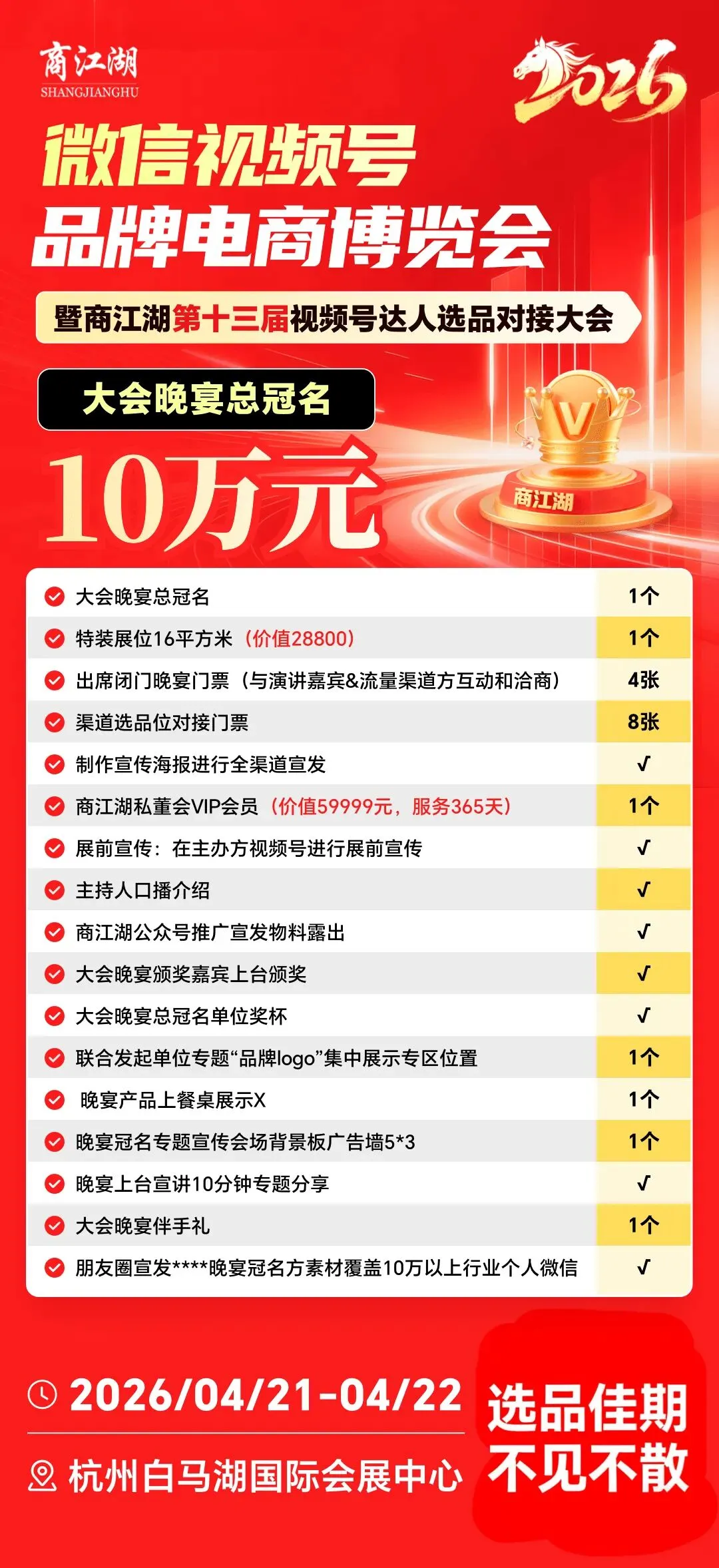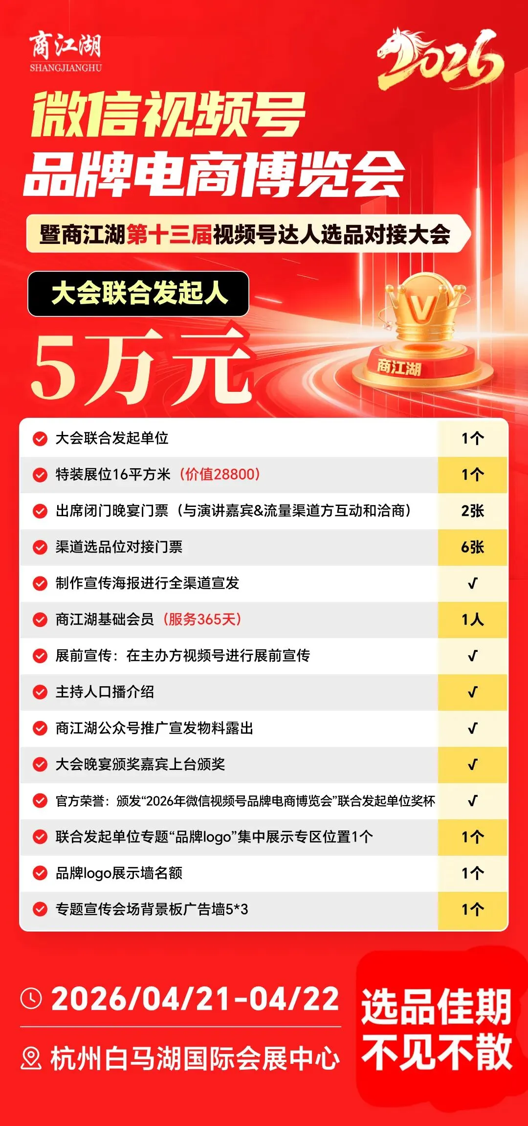 商江湖×奕星视频号 联合选品大会!4月21-22杭州白马湖会展中心等你!1000+全域渠道方包含60%视频号 30%抖快淘小红书及海外溯源主播10%私域渠道欢迎各大主播选品联络欢迎品牌商家选展位近期即将重磅绽放