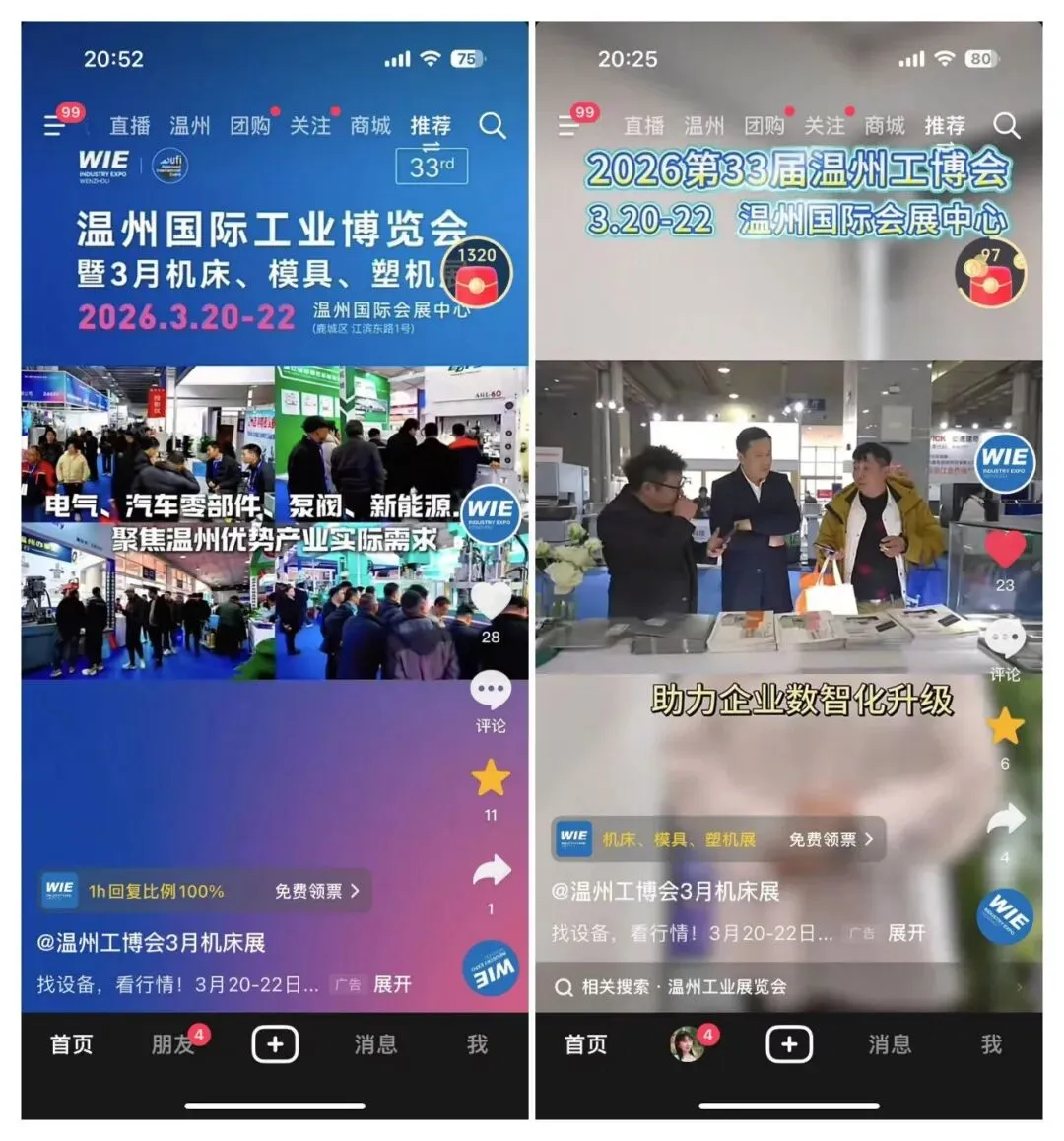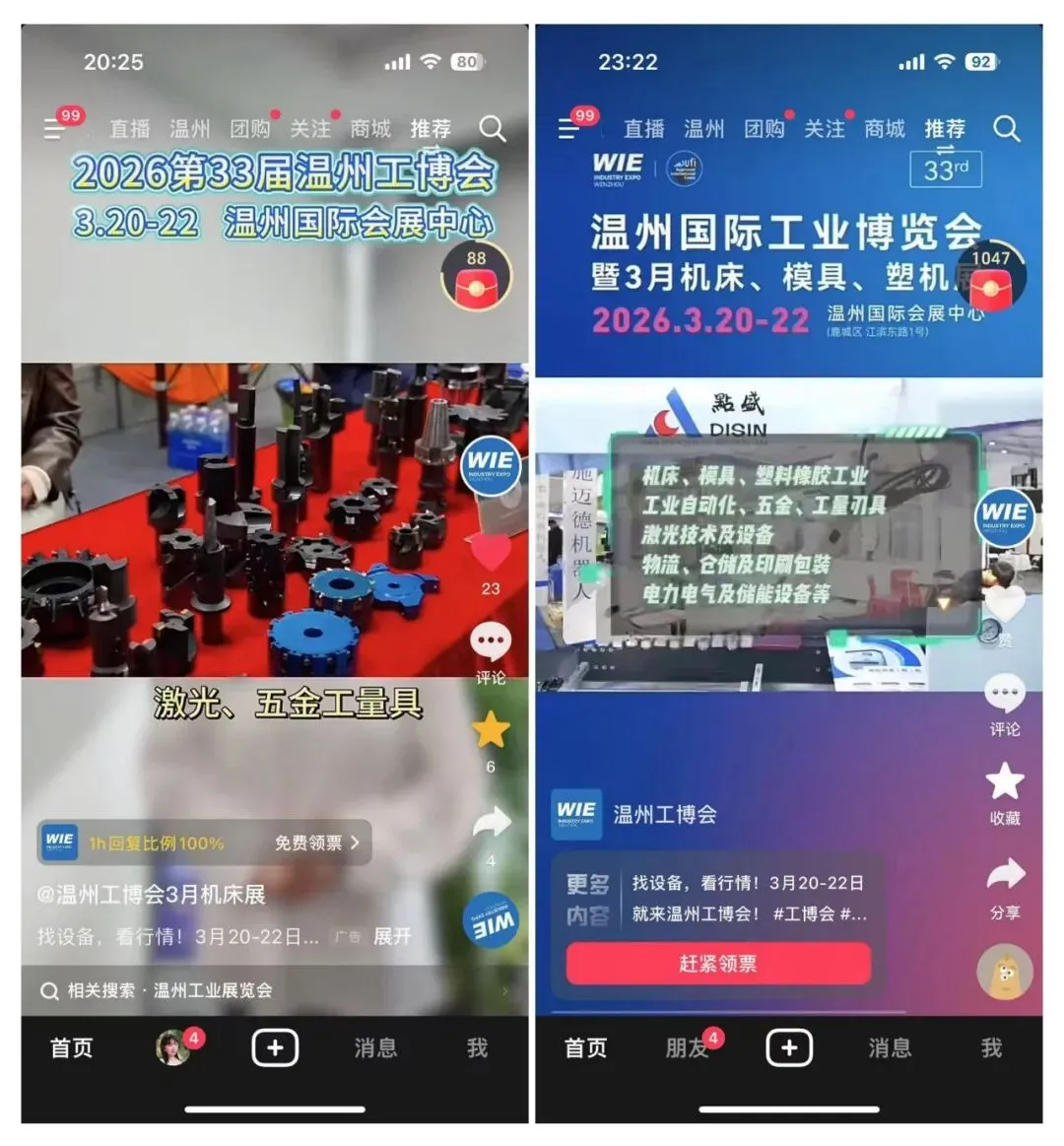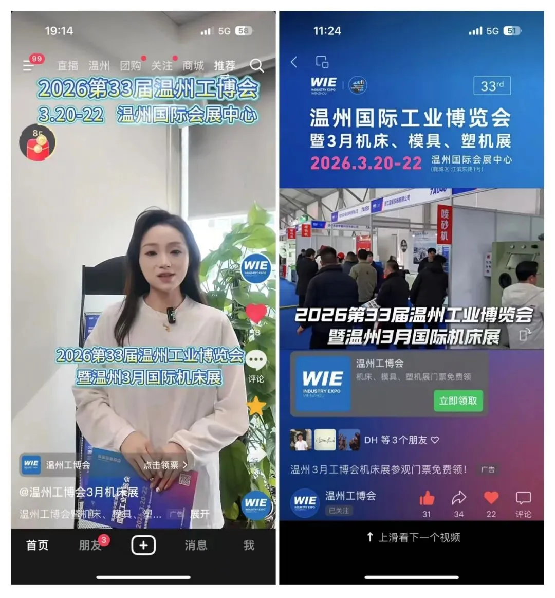 除了线下实地的视觉覆盖,线上的热度同样居高不下。本届展会在抖音、朋友圈、视频号等平台的信息流广告已密集上线。依托大数据算法,这些短视频与图文信息正精准推送至机械制造、五金加工、模具塑机等垂直领域从业者的手机端。通过创意内容展示本届展会的信息和亮点,线上流量正高效转化为实际的观展预约,实现了真正的“品效合一”。