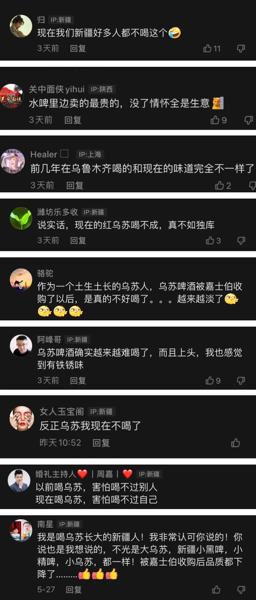 给大家划重点:这位博主总结乌苏上头快后劲大的主要原因是酿造的这个水质和工艺很一般,含有杂醇太多了,简单来说就是这酒不太行啊,在新疆本地也就三块五,而他们超市怎么也要八块十块,这个价位买瓶工业水啤真的不划算。