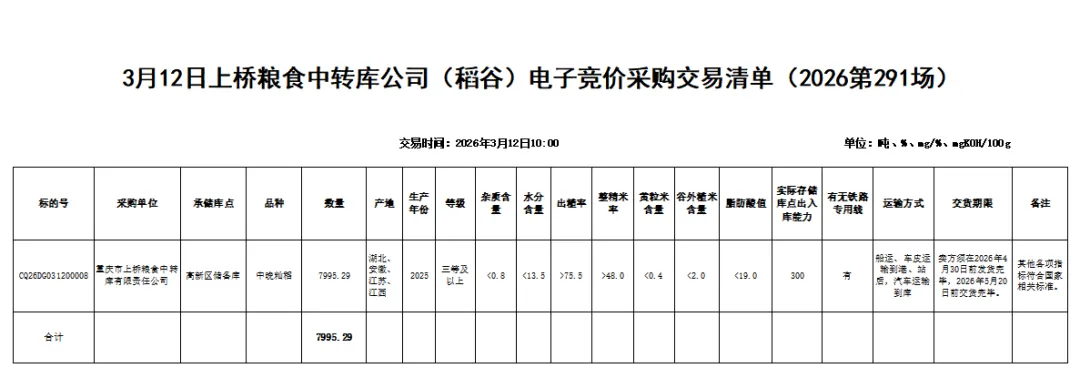 受重庆市上桥粮食中转库有限责任公司委托,重庆市粮油批发市场有限责任公司(即国家粮食重庆交易中心,以下简称“批发市场公司”)定于2026年3月12日10:00举办上桥粮食中转库公司(稻谷)电子竞价采购交易会,现将有关事项公告如下: