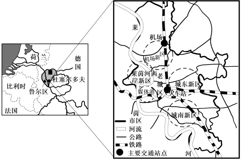 19世纪至20世纪初,鲁尔工业区因煤炭开采和钢铁工业发展而崛起,杜塞尔多夫成为鲁尔工业区的物流枢纽。20世纪80年代,杜塞尔多夫港口区通过改造升级现有厂房,改善工业用地环境,吸引大量媒体、信息、影视、娱乐和广告等企业入驻,形成特色鲜明的媒体港;莱茵河西岸新区不断完善基础配套设施,并依托原有产业基础引进多家通信技术企业落户发展;北部机场新区聚焦会展经济,举办国际时装博览会、国际船艇展览会以及大量艺术展览等,成为世界级会展中心;实现了从传统工业城市向现代服务型城市的转型,重塑城市空间格局。下图为杜塞尔多夫的地理位置与城市空间结构示意图。