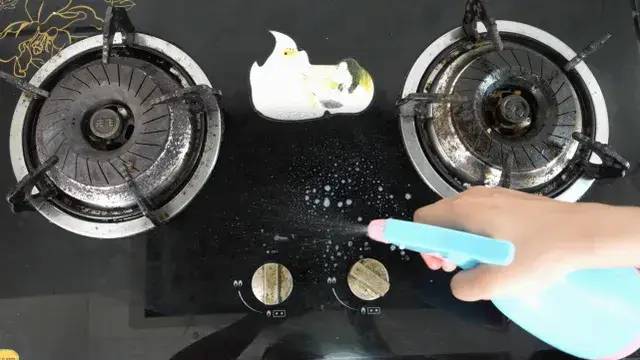 我们把清洗剂喷在灶台油污处,然后用抹布轻轻擦拭。您瞧,效果十分明显吧。