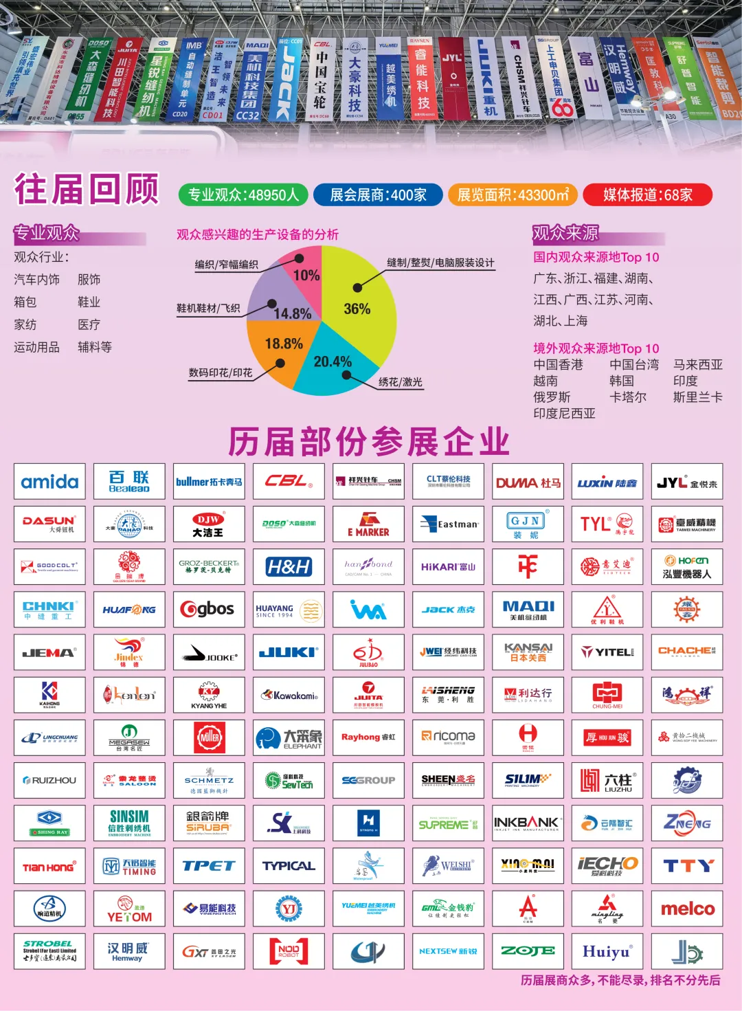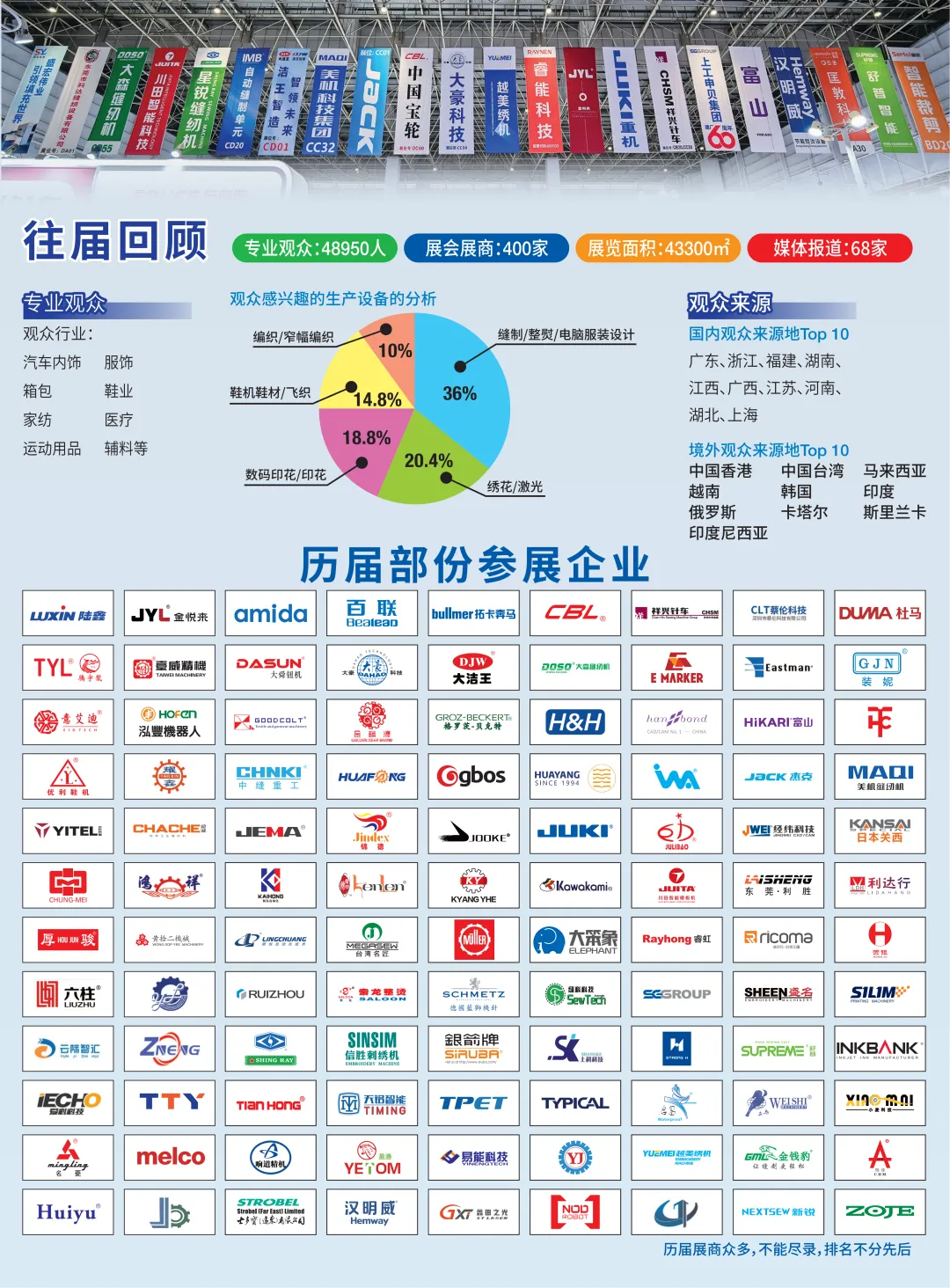 今届的四大展会预计将吸引超过500个全球品牌参展,展区面积达50000平方米。展出先进的智能缝纫设备、编织机械、裁剪、刺绣和激光设备、印刷设备、超声波设备、数码印刷、整熨、新材料、电脑辅助生产设计、鞋机和鞋材等智能先进设备和技术,积极配合下游行业的高端个性化生产需求,为服装业及鞋履业提升生产力。