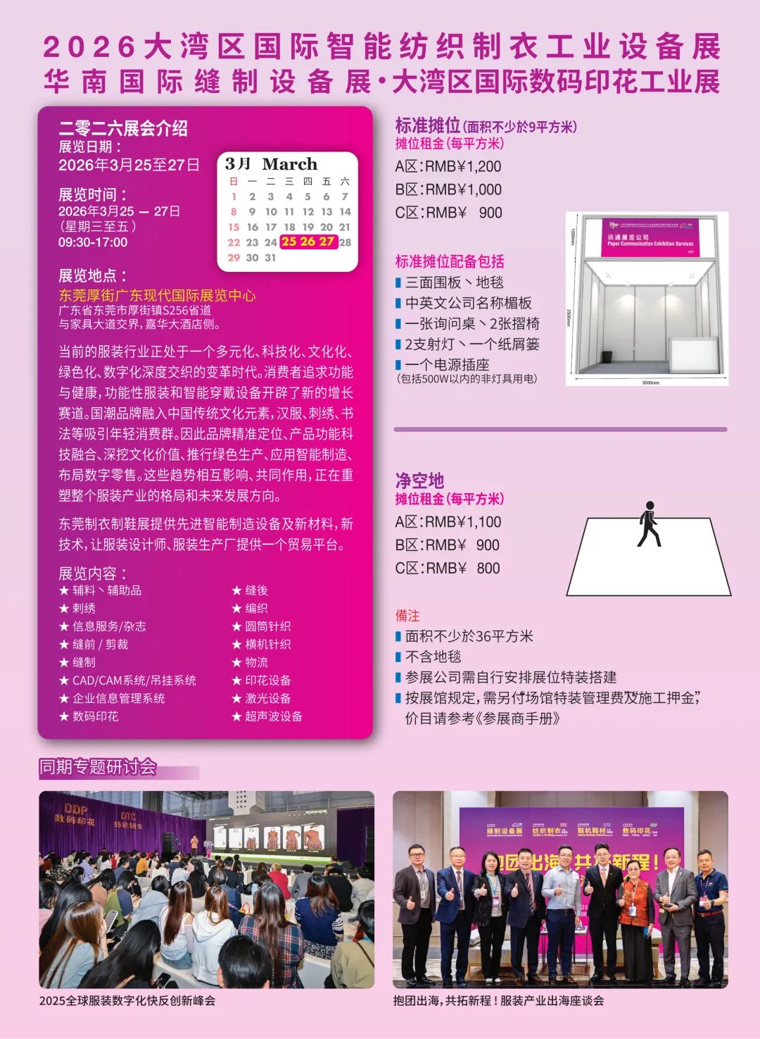 2026年3月25-27日在中国东莞厚街广东现代国际展览中心(GDE)同期举办的大湾区国际智能纺织制衣工业设备展、华南国际缝制设备展、大湾区国际绣花印花工业展以及大湾区国际智能鞋机鞋材工业技术展。本次展览会以“智造生态,链接全球”为核心主题,旨在打造一个涵盖纺织服装、缝纫设备、鞋机鞋材、绣花印花全产业链的前沿展示与商贸平台。