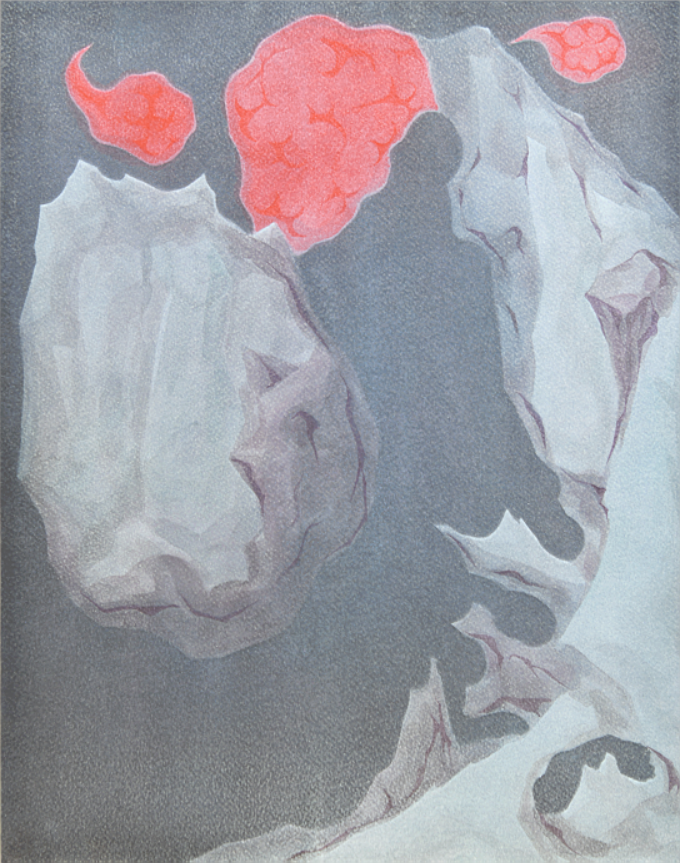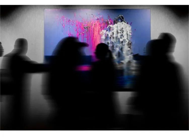超现空间部分则是白致源抽象绘画阶段后的下一个时期,艺术家的创作重返空间,画面中二维平面被三维形象充构起来,一个个的奇山怪石与身体相融相织。一种充满了东方奇梦的超现实时空被营造于此,承载于画,而这种形象视觉的营造也增设了月的魅力与奇幻。画面中,一个个人物的眼睛被刻画的恐惧而迷离,一男一女的阴阳设定,人物身体肤色的变化,均透露着艺术家对于青春的消逝,未来迷惑的诸多思考。在孤独内心的感召下,潜藏于艺术家身体深处的人与自然的东方禅意精神又重新被激活。
