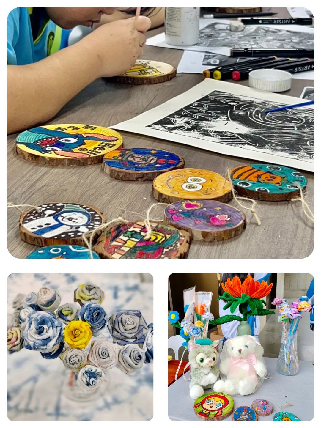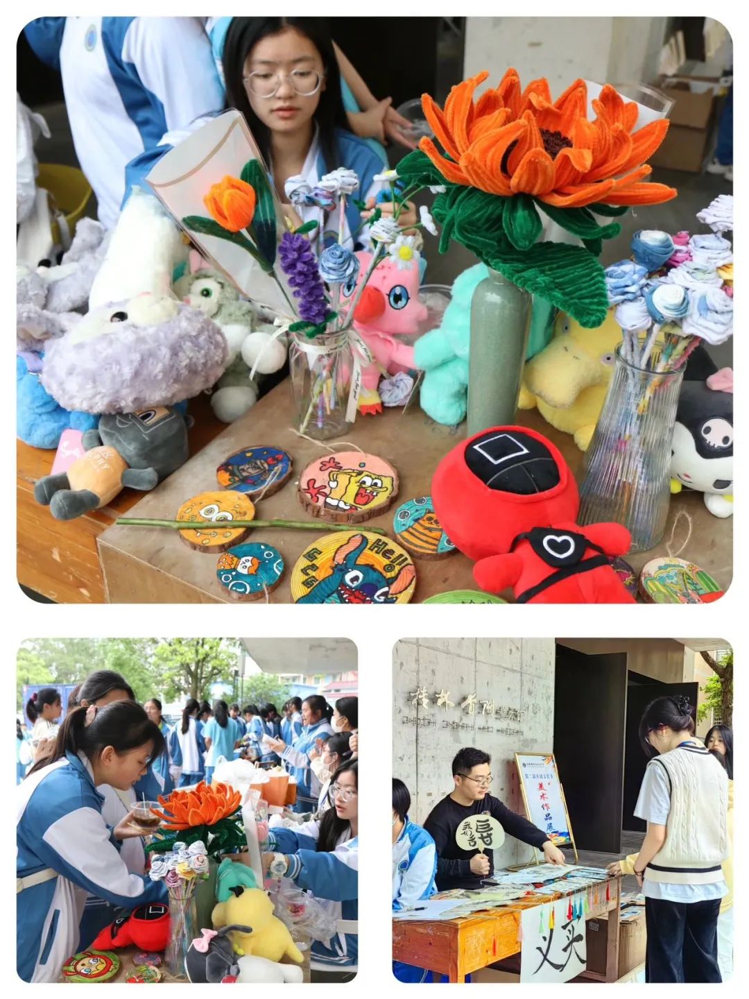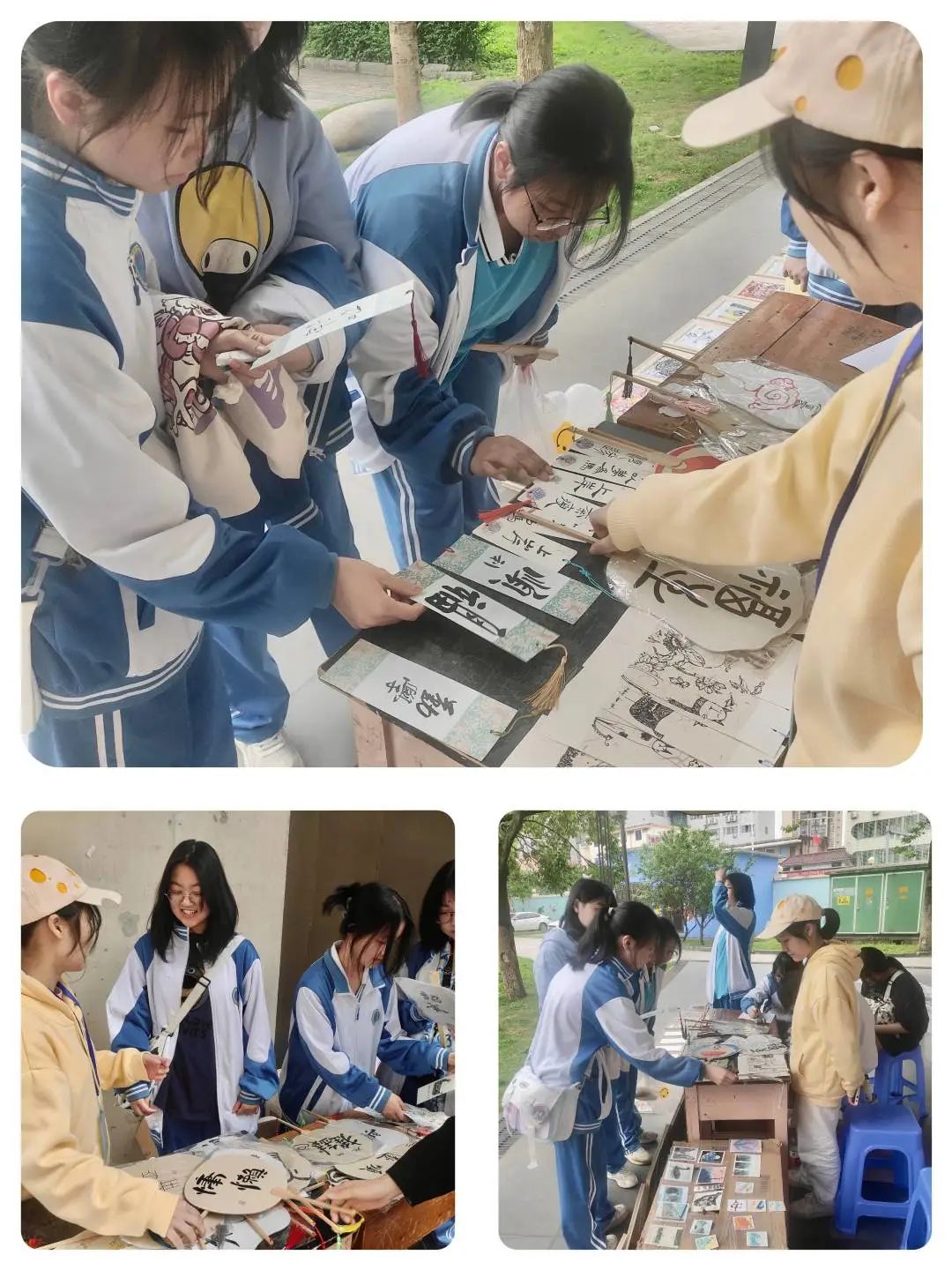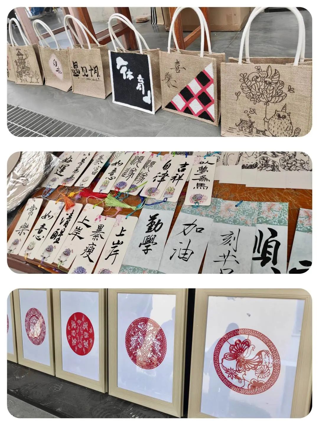 创意笔绘手提袋、DIY胸章定制、树脂画、手工鲜花、剪纸、古扇、油画棒手绘卡贴、手写书签等等原创文化产品独具创意,生动美观,展现了首附学子励志勤勉、求实创新的时代形象。