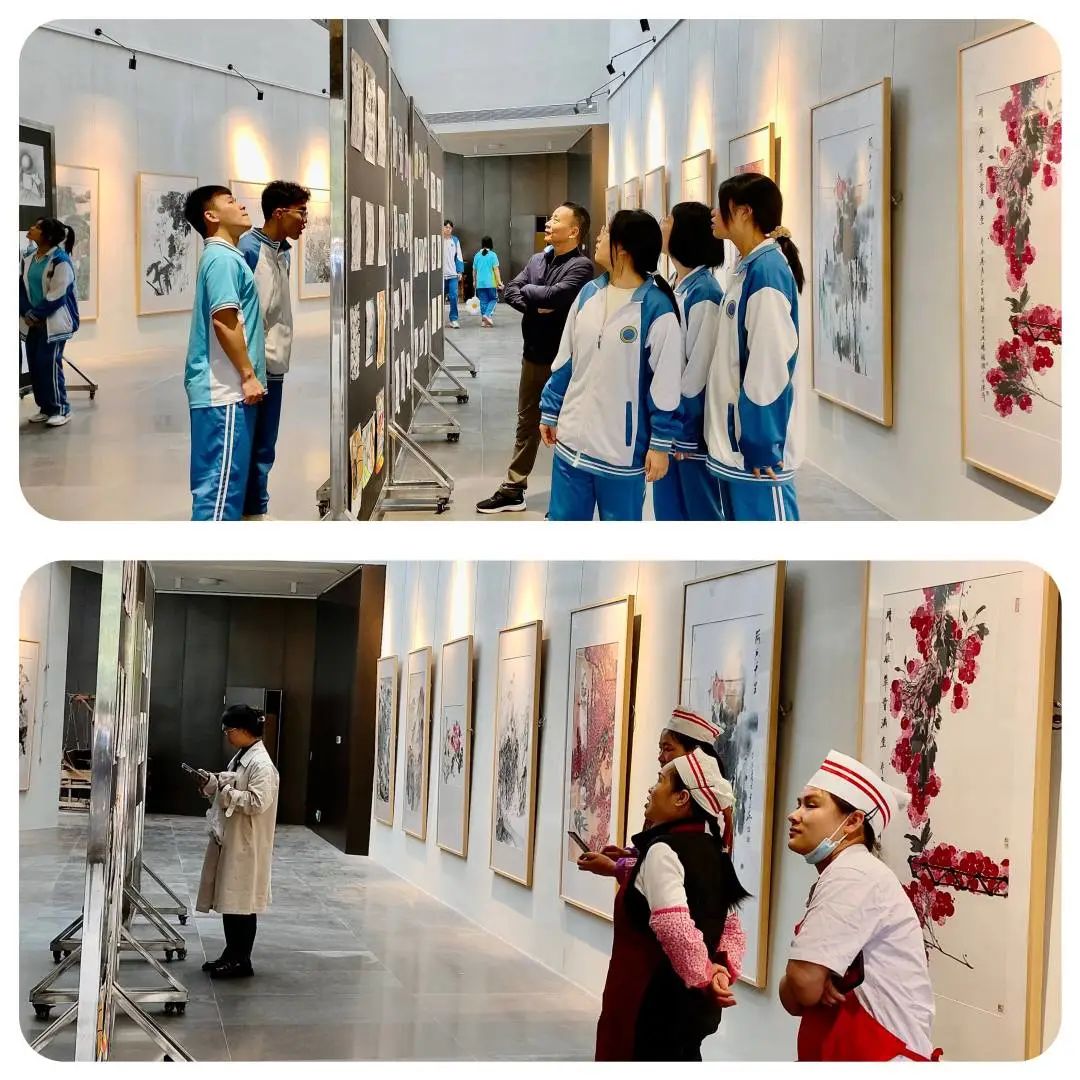 此次展出的作品各具特色,内涵丰富,诉说着同学们无限的遐想。绘画笔墨潇洒流畅,色彩斑斓,生动形象,凝聚了学生的才气和灵气,抒发了学生对生活和艺术的热爱,让我们感受到了绘画的艺术魅力。画展吸引了众多领导、师生驻足观看。