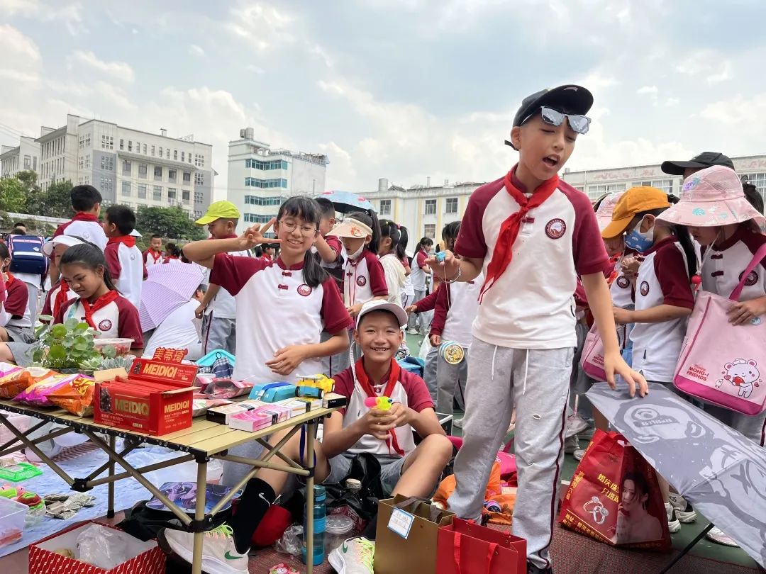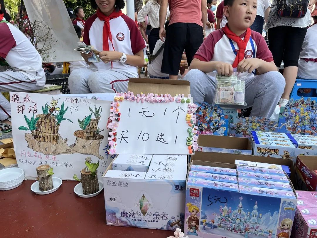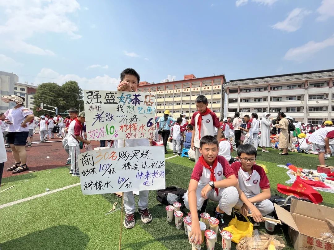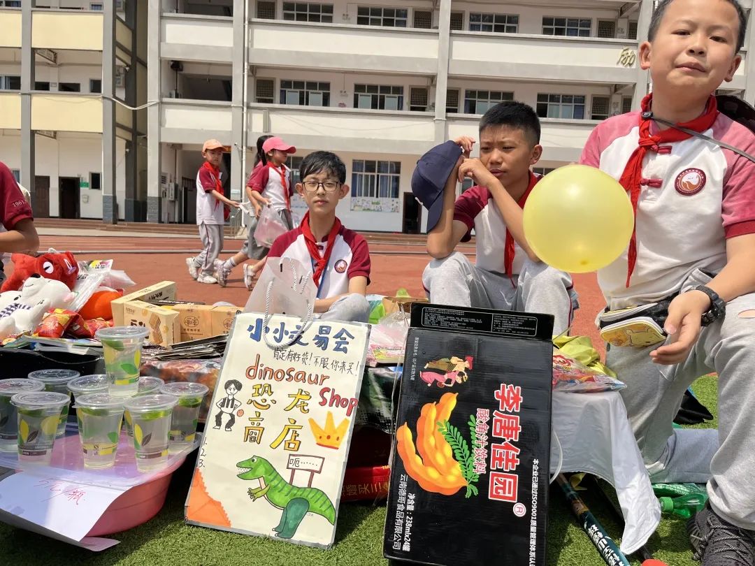 交易会上,“小老板们”销售着自己的商品:书籍、玩具、手工制品、自制美食,琳琅满目应有尽有。有的同学给每件商品标上价格,有的学生精心制作了海报,还有的同学发起了传单。操场上叫卖声此起彼伏,热闹非凡,大家纷纷被吸引驻足,参与其中挑选着自己心仪的物品。“小老板们”在照顾自己的生意之余,还不时地为自己的同学拉拢生意,全场一派和乐融融。