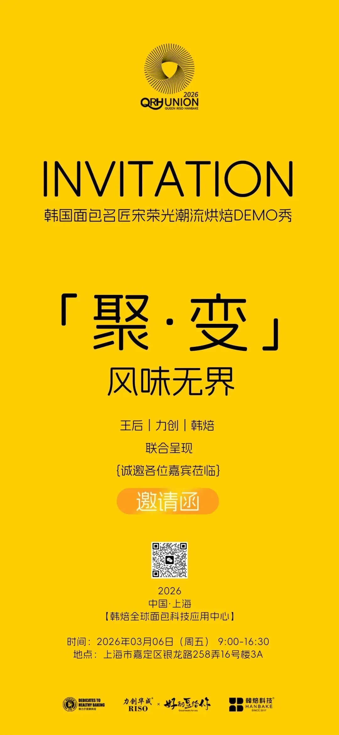 「聚•变」|2026首场烘焙demo秀圆满收官!2026年3月6日,由国内高端烘焙面粉品牌王后 ,创意馅料品牌力创华成 ,中国智造烤箱品牌韩焙联合发起的——2026「聚•变」系列大师demo秀第一场,在上海韩焙烘焙空间圆满收官!