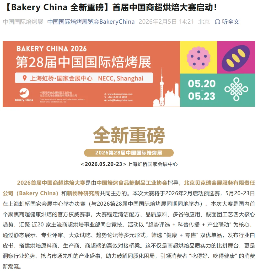 首届中国商超烘焙大赛启动!2026首届中国商超烘焙大赛是由中国焙烤食品糖制品工业协会指导,北京贝克瑞会展服务有限责任公司(Bakery China)和新物种研究所共同主办的。本次大赛将于2026年2月启动预选赛,5月20-23日在上海虹桥国家会展中心举办决赛(与2026第28届中国国际焙烤展同期同地举办)。本次大赛是国内首个聚焦商超健康烘焙的官方权威赛事,大赛锚定清洁配方、品质原料、多谷物应用、酸面团工艺四大核心趋势,汇聚 近20 家主流商超烘焙事业部同台竞技。