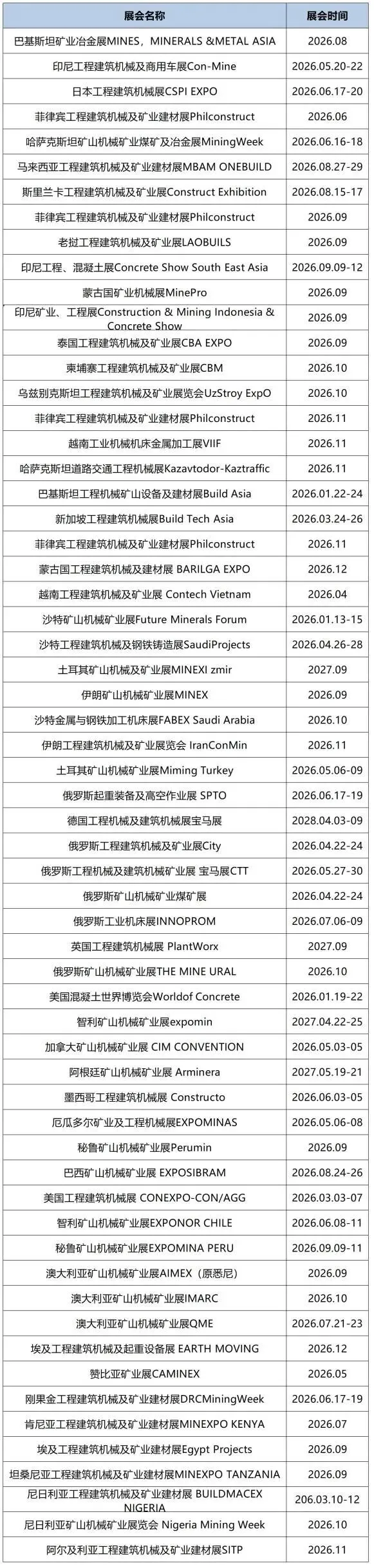 2026年全球矿业机械展会计划表