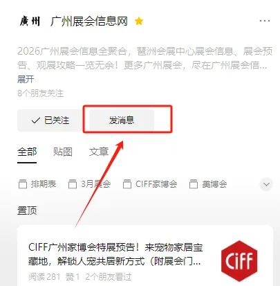 2.点击【发消息】打开后台聊天框,私信关键词“广交会”获取报名链接