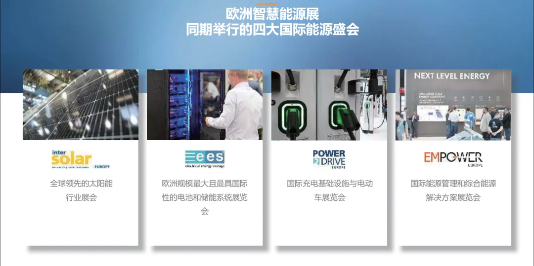 欧洲智慧能源展汇集了Intersolar Europe、ees Europe、Power2Drive Europe 和 EM-Power Europe 四个展会。