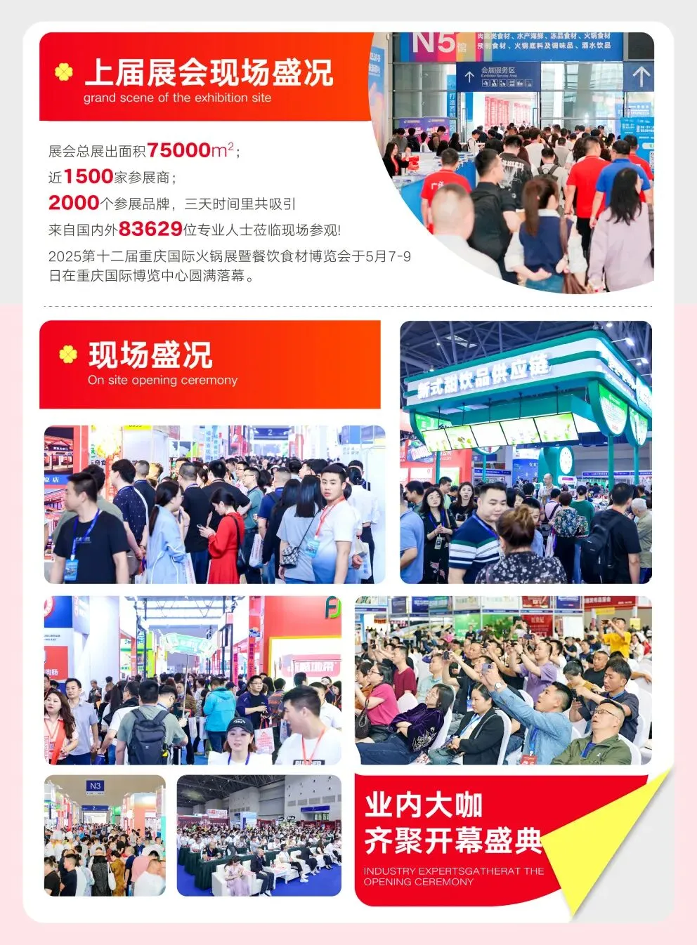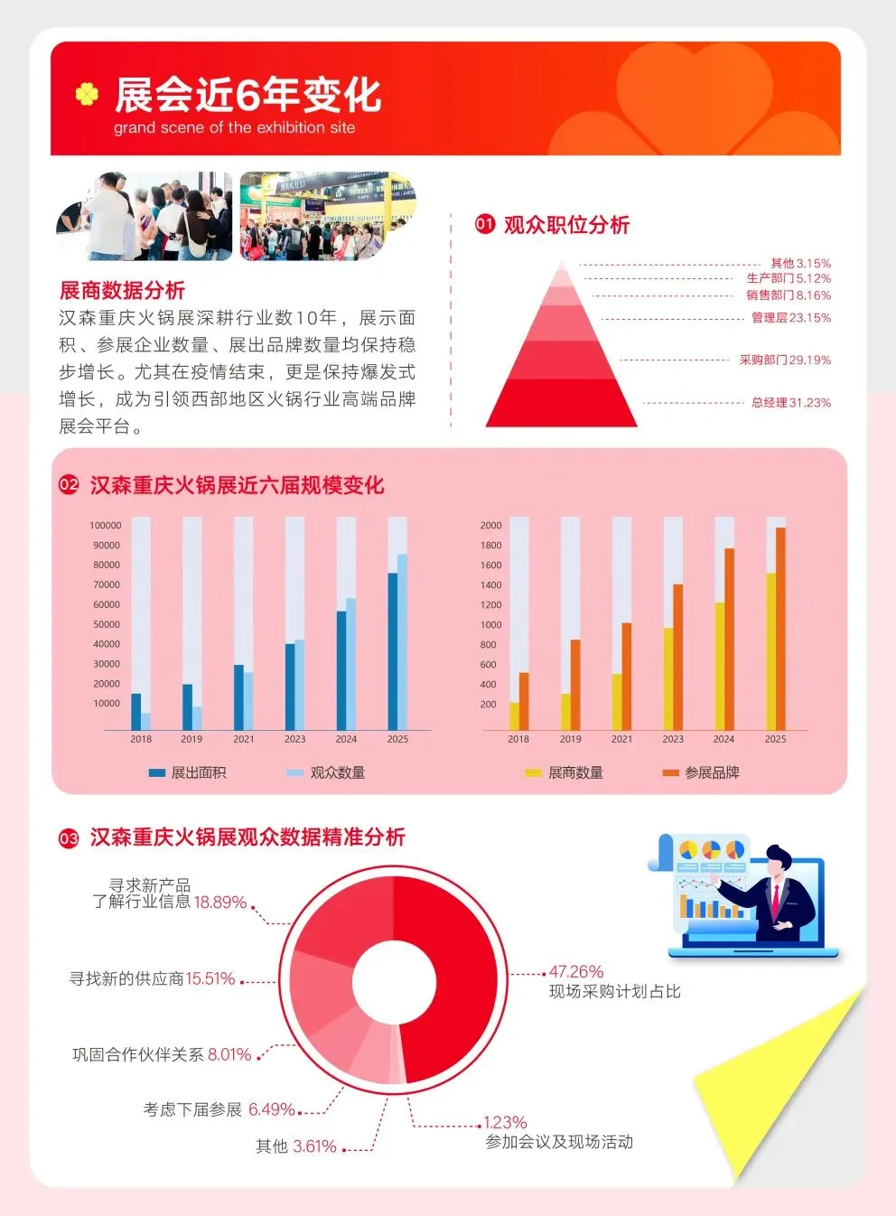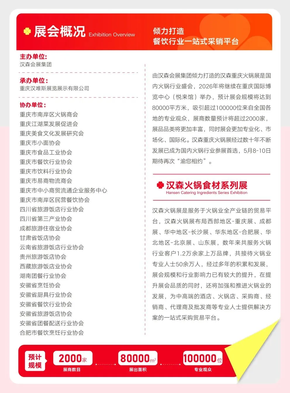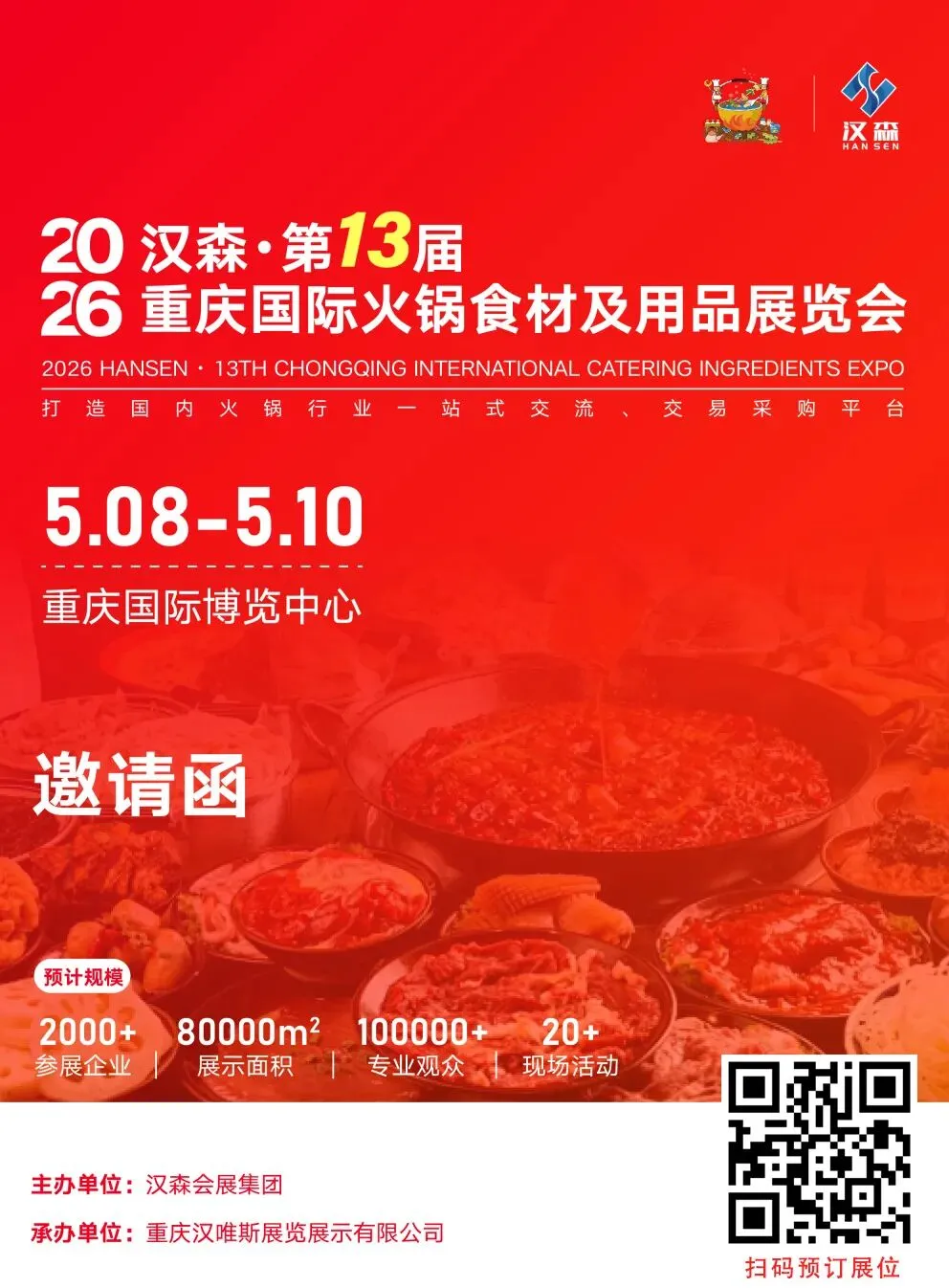 汉森重庆火锅展已成功举办了12届,致力为火锅餐饮同行打造一站式采购解决方案,是国内火锅餐饮行业一站式交流、交易采购平台。已成为国内餐饮行业规模最大、最具影响力的博览会之一。2026年将继续在重庆国际博览中心(悦来馆)举办,预计展会规模将达到近80000平方米,预计吸引超过100000位来自全国各地的专业观众展商数量预计将超过2000家,展品品类将更加丰富,同时展会更加专业化、市场化、国际化。