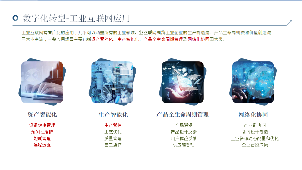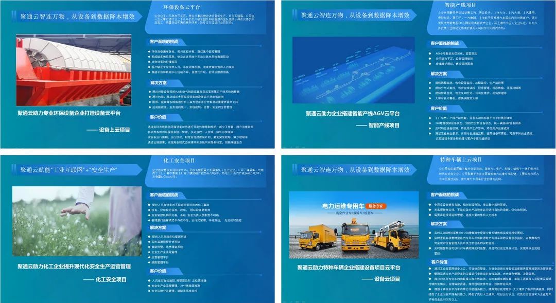 聚通工业互联网平台应用围绕⽣产制造流、产品⽣命周期流和价值创造流三⼤业务流,涵盖几乎所有的⼯业制造领域,面向资产智能化、⽣产智能化、产品全⽣命周期管理及⽹络化协同四大应用场景,以设备云为基础的能耗双控和安全生产为抓手,成功打造诸多成功实践。