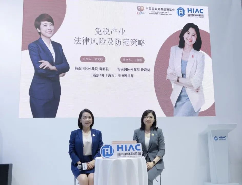 2023年4月14日,徐文峥、王薇娜律师作为海南国际仲裁院仲裁员,作“免税产业法律风险防范及应对策略”主题讲座,深度剖析海南自由贸易港免税产业经营现状,全面解读离岛免税政策,引用具体案例讲解免税品消费者及经营者可能遇到的法律风险及应对策略,吸引了大量展商、采购商和观众驻足聆听。现场观众就免税政策、涉外法律服务对接、境外纠纷仲裁流程等问题进行交流,反映良好。