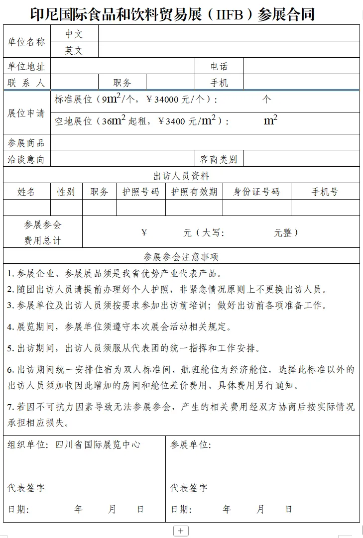 为落实《中国-东盟全面经济合作框架协议》,不断推动两国企业的对接合作。鼓励和支持企业开拓多元化市场,培育外贸竞争新优势,促进“一带一路”国际合作,进一步拓展国际市场。中国贸促会贸易推广交流中心与四川省贸促会合作,拟于2026年5月6日至13日组织企业赴印尼参加“印尼国际食品和饮料贸易展IIFB”,并在印尼和马来西亚开展贸易投资合作洽谈活动,深入拓展“一带一路”市场。
