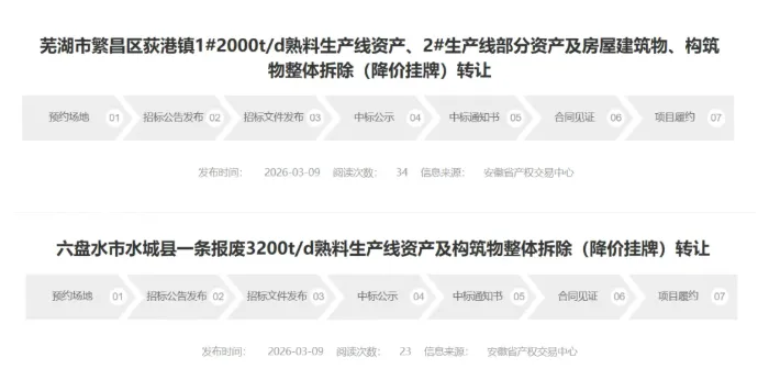 同步挂牌处置的水城海螺盘江 3200t/d 熟料生产线位于贵州六盘水水城县,设计日产能 3200 吨,核心装备包括回转窑、生料立式磨、预热器系统、篦式冷却机等全套熟料生产装置,并配套完整供配电、蒸汽锅炉及基础构筑物,整体打包降价转让,转让底价为2024.95 万元。两条生产线挂牌时间一致,挂牌期为3 月 9 日至 3 月 13 日,共 5 个工作日,采用网络动态报价模式竞价交易。