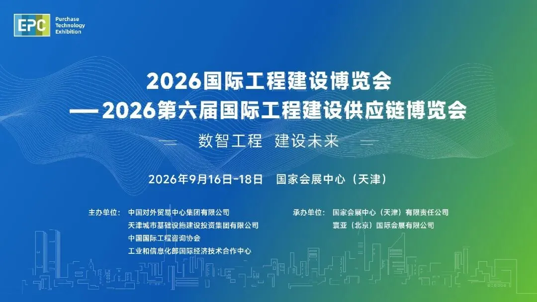 为深入贯彻党的二十届四中全会关于“加快构建新发展格局、扩大高水平对外开放”“推动绿色低碳发展、建设现代化产业体系的战略部署”的战略部署,落实“十五五”规划建议中“建设现代化基础设施体系、增强产业链供应链韧性”的核心要求,进一步强化国际工程建设供应链协同效能,助力京津冀区域基础设施互联互通与高质量发展,由中国对外贸易中心集团有限公司、天津城市基础设施建设投资集团有限公司、中国国际工程咨询协会、工业和信息化部国际经济技术合作中心等联合主办,国家会展中心(天津)有限责任公司、寰亚(北京)国际会展有限公司(国际工程)等承办的2026国际工程建设博览会、2026第六届国际工程建设供应链博览会(以下简称博览会)定于2026年9月16至18日在国家会展中心(天津)举办,同期将举办2026绿色低碳博览会。