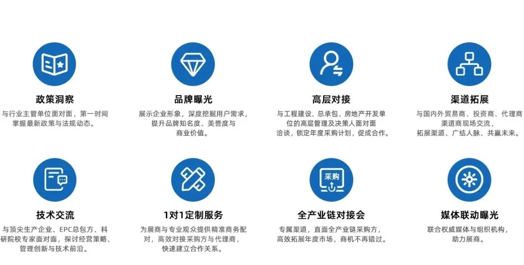 央企及地方总包商参与度高,供采双方对接、采购观展团,特邀EPC工程总承包单位洽谈区内对接。组织以集团为单位的采购观展团。提前登记采购单位拟在建工程项目、工程采购计划需求;提前提供展商展品宣传;现场VIP采购单位宣传册,通过采购方调研反馈,为展商提供更高附加值的专属服务;提前调研采购单位考察供应商意愿,展后按计划有序安排,为展商提供增值服务。