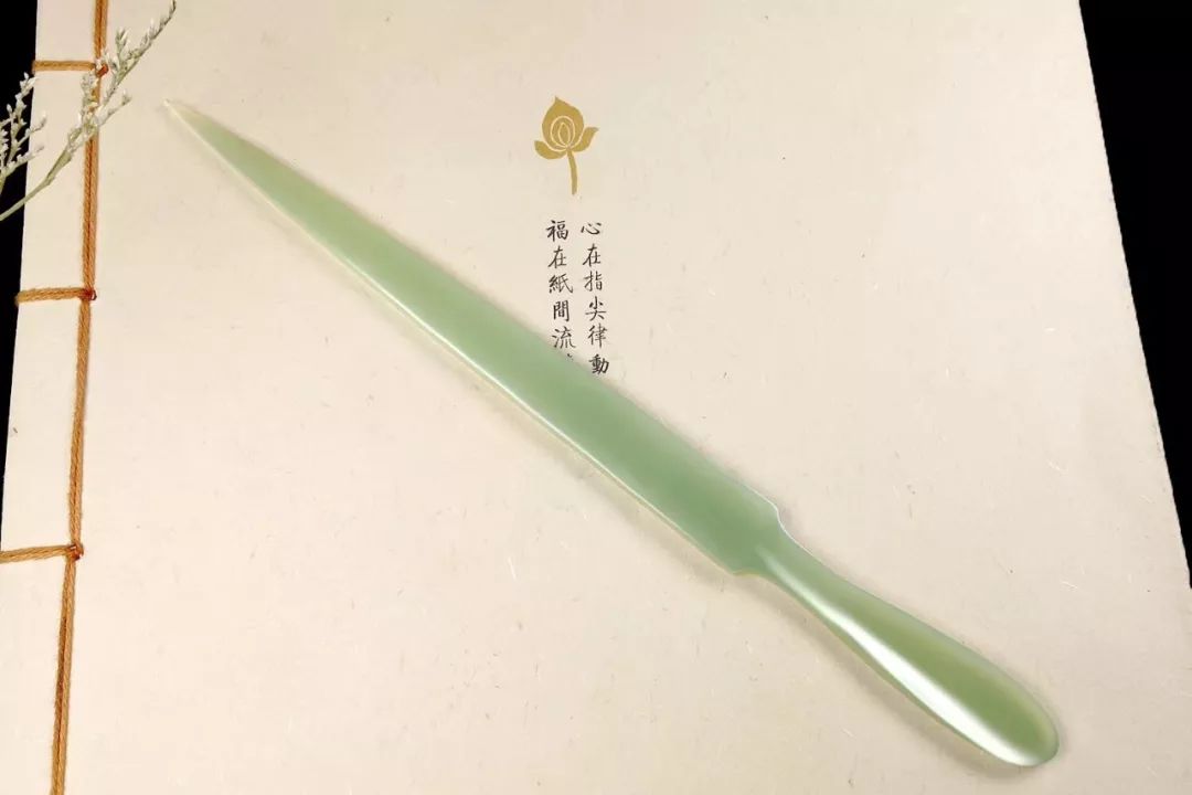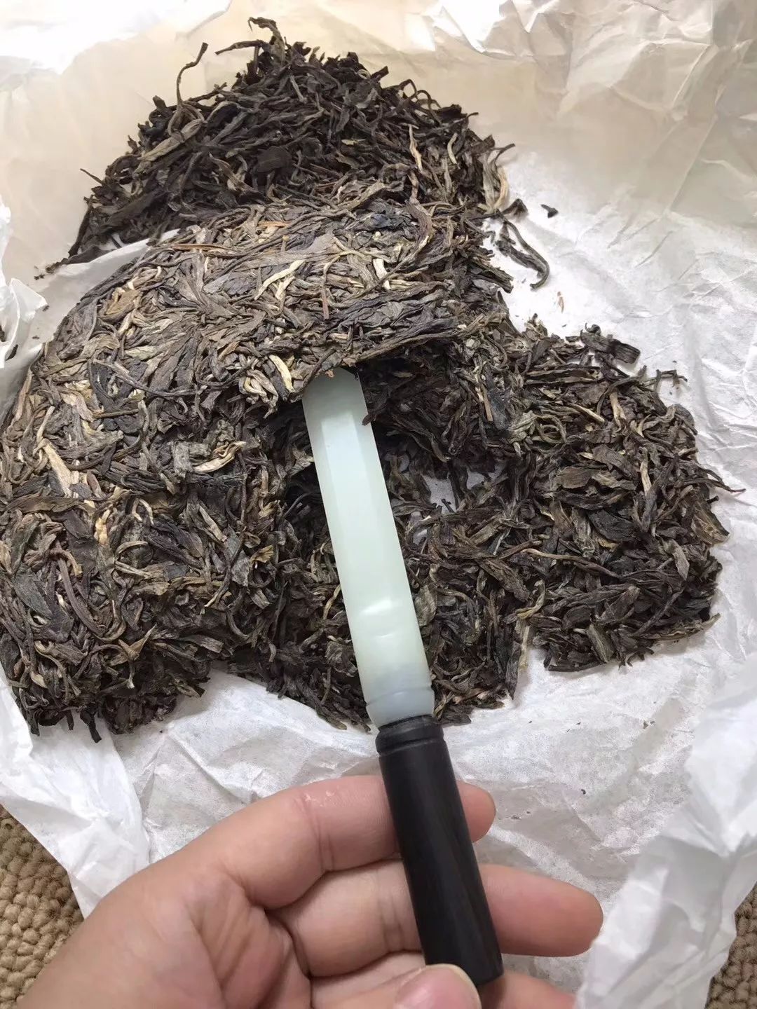 普洱茶饼不能用手掰,而是用特质的茶刀一点点撬掉。玉雕中的茶刀是很少见的,很多人几乎没见过,因为不太实用,所以制作的也很少。茶匙也是,用来把茶叶挖进壶中泡茶。